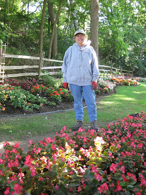 We had a great volunteer turnout today with plenty of assistance. Kay and Eva were in early to tackle some serious weeding and tidying in the front entrance garden and near the shade garden. The ladies always do a nice job and today was no exception. Above are Myrt (left) and Mary doing some planting near the gazebo garden. The ladies also did some weeding and did a nice job. Resa was also in to tidy in the North point garden. Betty (below) was in to touch up her beautiful areas near the arboretum. Jan R. tidied up the Scottish garden (her assigned garden) and Dr. Gredler was in for mowing. Vern worked on some carpentry projects all day and we also saw Jean, Charlotte, Chuck, Geesje, Janice, Maury and many others today. The second photo down is the 'Gryphon' begonia which is planted for this silver-highlighted foliage and not the blooms (rarely seen).