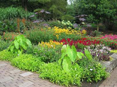 Awesome shot above with this hummingbird enjoying a red salvia (courtesy of Marsha M.). Thanks Marsha! In the gardens today, I unexpectedly saw one of my professors from the Landscape Architecture Department at the University of Illinois (Champaign-Urbana). Dr. Harkness (retired) was at the gardens with Diane and Claire from the University of Illinois Arboretum. Dr. Harkness is involved with some designs and master planning for the arboretum and the ladies are involved with maintenance and upkeep. We had a great conversation and shared ideas, challenges and other information. I saw the beginning of this arboretum over 15 years ago and think I'll trek down there some day to see the progress. The gardens were extremely busy today with many guests and plenty of participants that arrived for the Family Fun Day out in the gardens. Kris K., Maggie and all the education volunteers did a dynamite job and will repeat the fun this Sunday. It was nice to see so many children out in the gardens and everything was looking good like the sunken garden below. We could use some rain but the cooler temperatures are allowing us to catch up with some watering. Some other plants of interest can be seen further down.