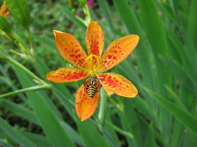 There were lots of kids around the gardens today including many that enjoyed the Story & Stroll program this morning. It's so nice to see them out in the gardens and I hope these kids will become the teenagers that enjoy fresh air and avoid the basement "video game dungeons"! We saw Kris K., Maggie, Barb H., Dale, Leslie and many other education volunteers assisting with this fun event. Above is the resurrection or August lily (Lycoris squamigera) blooming right on time. The foliage of this bulb came up in spring, went dormant by July (like daffodils) and these "naked" (leafless) stalks pop up quickly and the blooms are beautiful. We had a busy day out in the gardens. It was a bummer not to get some rain last night but we're still fairly damp and nothing is currently drying out. We'll be shifting to more irrigation and sprinklers in the coming days as needed. Our watering bill this year for the gardens should be significantly less than last year! Below are some shots from today (identified under each image).