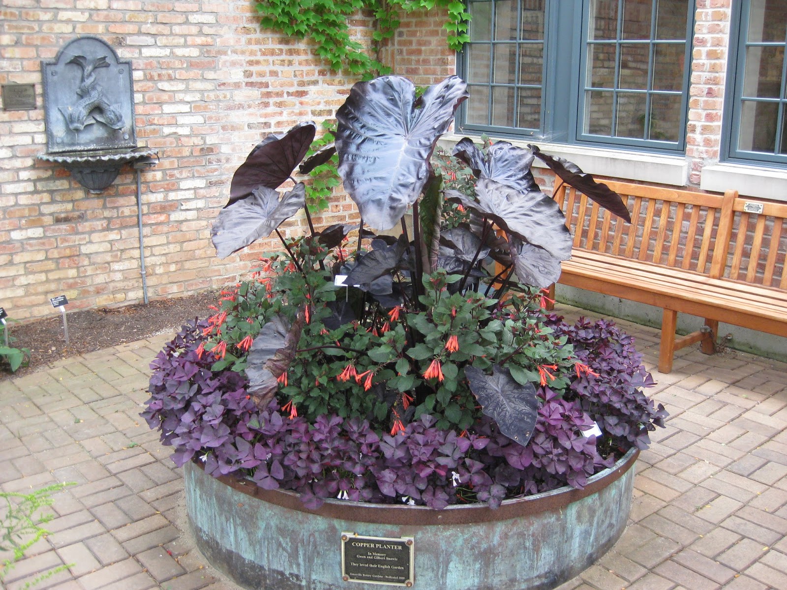 'Royal Hawaiian Coral Black' elephant ear (Colocasia esculenta) in the center of our copper cheese vat planter in the English cottage garden
