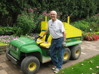 I love Vern's shirt (seen above)! Vern was one of many Grumpies and Grumpettes that volunteered today. Vern, Jim and Dick H. did some carpentry today, including replacing some boards on the arched bridge (see Dick below). The guys have many projects to work on which will include some new bench construction in the coming weeks. Gene, Steve, Bob C. and Ron P. worked on setting up more tents for the Family Fun Day on Sunday (see our website for details). The guys then moved on to other projects. Del (third photo down) tidied up the sunken garden which is starting to see leaves falling early off of our cottonwoods (Populus deltoides). We'll be perpetually raking up leaves now until the snow flies! Zach did a nice job watering multiple areas including the yard. Our Grumpettes included Mary R. (second photo down), Vicki, Karla and Suzy. The ladies weeded and tidied in the Japanese garden and did a great job. Dr. Gredler was in for his mowing rounds. Hal and Doris tidied their area and did some watering as well. We also saw Mary W., Maury, Maggie, Kris K., Bill O., Rose N., Rose's granddaughter Lydia and many others. Further below are some more shots from today. There was so much color to photograph and this was just a small portion of what I photographed out in the gardens today!