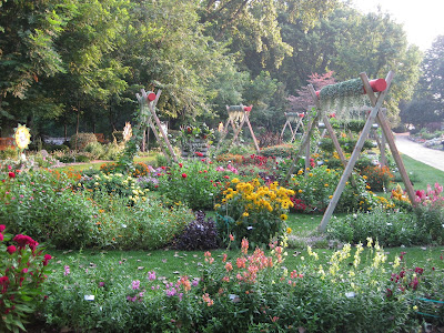 The staff had a busy day in the heat although the morning was very pleasant. I was spraying herbicide this morning around the Horticulture Center property to tidy up before the Fall Plant Sale (September 14th and 15th, pre-sale for RBG members on September 13th) and ran in to one of our compost piles above. I almost sprayed this and then looked closer to see tomatoes (Lycopersicon), flowering tobacco (Nicotiana), lemon balm (Melissa officinalis), breadseed poppy (Papaver somniferum) and many other goodies. All of these re-seeded plants have created an interesting arrangement that I'm going to let go and observe! Larry ran irrigation all day, weed whipped extensively and worked on an electrical issue in the woodland walk (later joined by Tom C.). Larry learned that weed whipping a hot pepper (Capsicum sp.) and dangling peppers creates an instant pepper spray that he'll never forget. Pat sheared boxwoods (Buxus) and yews (Taxus). He also push mowed, watered containers and had some other tasks as well. Big John set up sprinklers in multiple areas, push mowed and prepared two areas for new benches. Cindy watered, fertilized, tidied multiple areas and put together a nice cutting display for the Parker Education Center. Cheryl did some watering (including the yard) but spent most of her time rotating between three sections that needed her attention (tidying, weeding, etc.). She also picked lots of veggies out of the gardens to share. Below are some other sightly plants from today.
