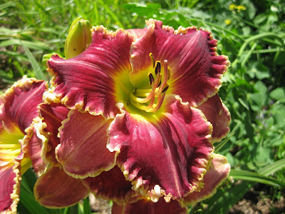 Volunteers were a vital part of all the activity today. We had a strong turnout of both Grumpies and Grumpettes (like Suzy above and both Marilyn and Shirley below). Suzy, Marilyn and Shirley (second photo down) did a great job weeding and planting in the Nancy Yahr Memorial Children's Garden which currently has our "Pollinator's Paradise" theme. The ladies put in another 500 "filler annuals" to address some new (and old) gaps. They shifted to weeding then with Steve in the formal gardens. Karla and Eva were planting near the arboretum (more gaps) and also shifted to weeding. Bob C. and Zach skimmed more path gravel and tidied up along the edging near the shade garden. Ron B. continued organizing pots and Dr. Gredler was in for more mowing. Dave T., Vern, Jim and Ron Y. worked on some carpentry projects and installed some of our new NO TRESPASSING signs. The guys have some future projects to accomplish soon including making benches and creating "coyote cutouts" out of plywood to keep the geese (and their poop) away. We also saw Larry H., Maury, Mary W. (office work), Dr. Yahr, Judy L., Ray, Art and many others. Further below are some neat plants seen today. Note that the Potter Daylily Collection is at peak as evidenced in the three daylily (Hemerocallis) samples below.