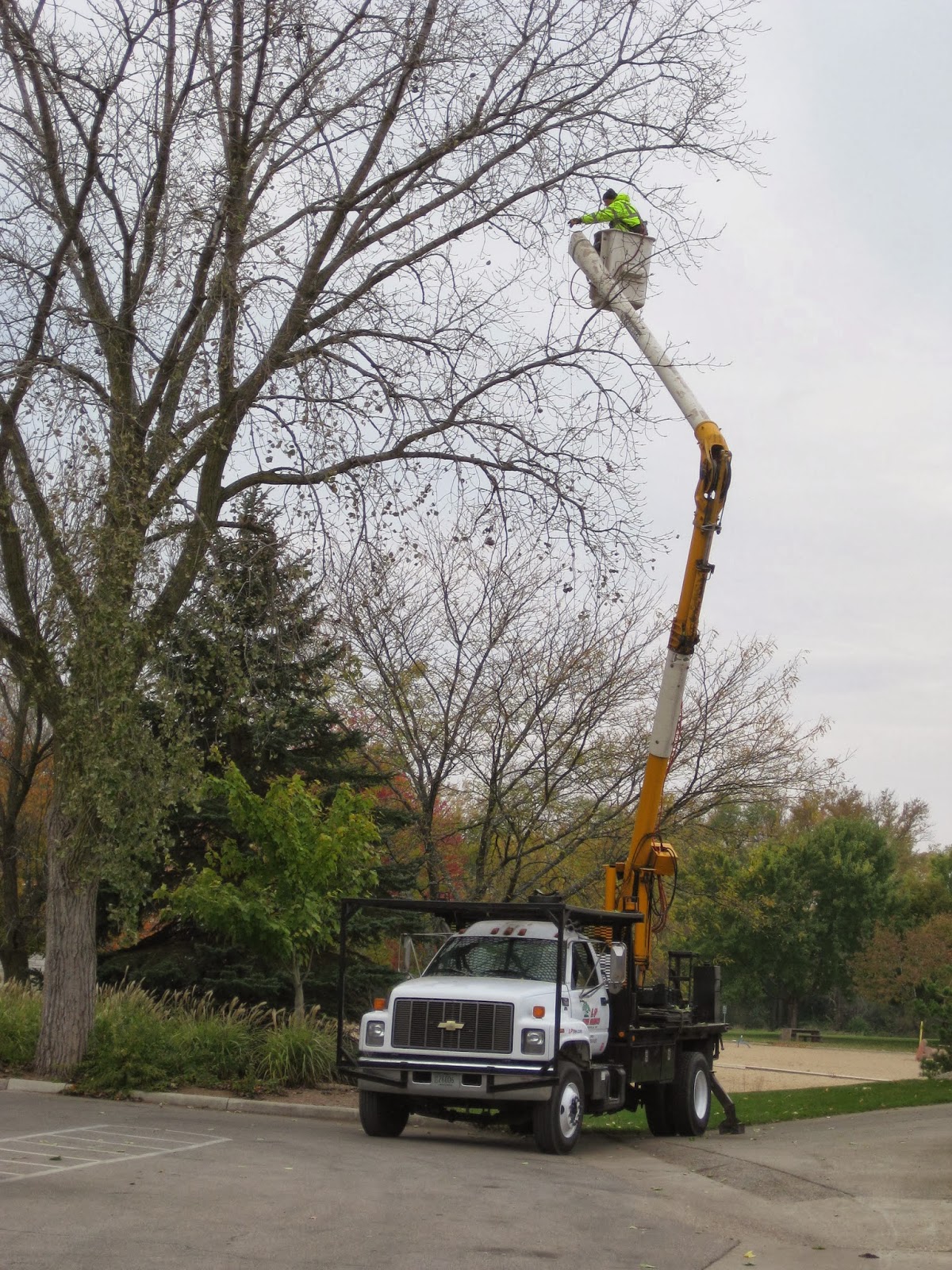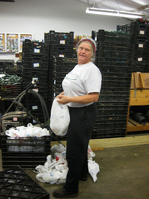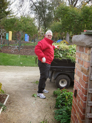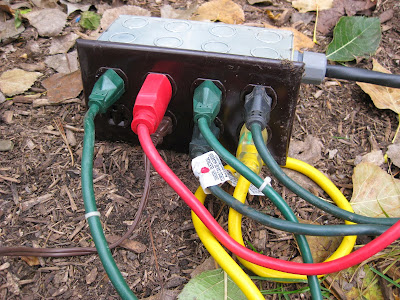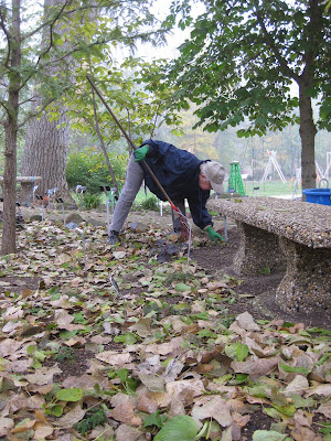 The Horticulture Center was buzzing this morning with plenty of work. The team directly above was processing more half gallon milk jug luminaries which are used to guide HLS visitors around the show. We'll end up using over 2,000 of these this year and we're replacing our luminaries with donations and are recycling the older ones (over 12 years old!). Dr. Gredler (blue) and Ron P. are in the foreground prepping the jugs while in the back are Pat and Gary (also below) filling these with some pea gravel to keep them upright and secure along the route. They had a great system going and we'll continue with this effort throughout next week. The second photo down shows Steve and Vicki working on wrapping our new PVC candy canes with lights. They did a great job and were here almost the entire day working on these. We think they'll be back to finish them tomorrow assuming they don't have nightmares about candy canes this evening. The third photo down shows Ron Y. (drilling) and Jim working on a carpentry project. Dave T. and Vern were also involved and Vern finished his bench lettering project as well. Dick H. ran to the dump, went on multiple fuel runs and continued cutting aluminum for our plant stakes. Maury ran some timely errands for us and Suzy (fourth photo down) was our lone volunteer gardener today although she left after a mid-morning saturation. We also saw Rollie, Arnie D. and some others today.
