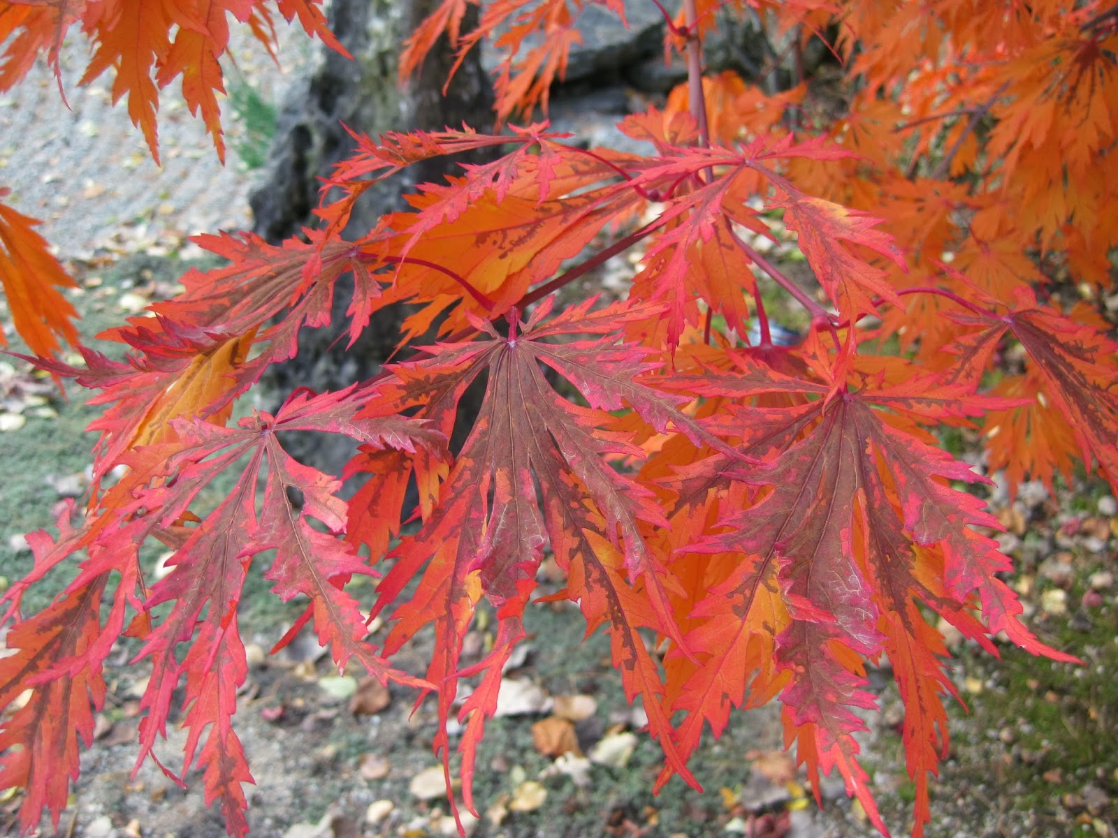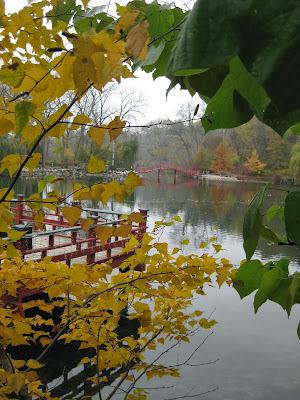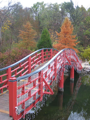Happy Halloween! My girls think they're too old (13 and 23) to trick-or-treat but I've always enjoyed this holiday. Unfortunately, the beneficial rains that the gardens are receiving today may make it unpleasant for all but the toughest of trick-or-treaters. It's nice to realize how far we've come this fall with Holiday Lights Show (HLS) preparations as well as garden work. While today was effectively a washout for outside work, the amount of interior activity was impressive. I was able to tour the gardens this morning in the drizzle and with perfect overcast lighting, the remaining fall color was extremely vivid. Above is another of our 'Aconitifolium' fullmoon maples (Acer japonicum) which continues to be my favorite tree for fall color that has a long period of transition and gets better and better. We now have three of these and I'll find room to squeeze in more in the future. Below are three other nice photos in and around the Japanese garden featuring some nice, late season color.