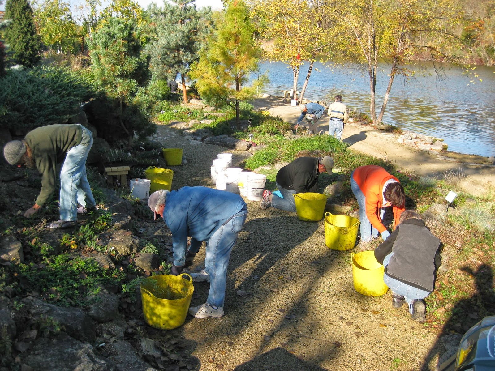 The group seen above in the alpine garden (also on Saturday) was organized by Iza Goroff, one of our volunteers. There were, in addition to all of the volunteers listed above, another ten volunteers helping with weeding and planting efforts in this garden. These volunteers included many members of the WI/IL Chapter of the North American Rock Garden Society (NARGS) and some of our existing RBG volunteers (Iza, Rose Marie & Werner). They did a dynamite job out in this garden which really needed their attention. This group also had two work days at RBG in 2012 that were also very helpful. This work day for the group then transitioned to a lunch meeting and presentation by Iza. We thank this team for their efforts as well!