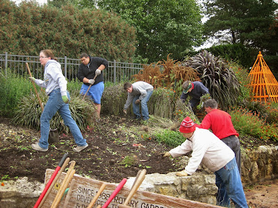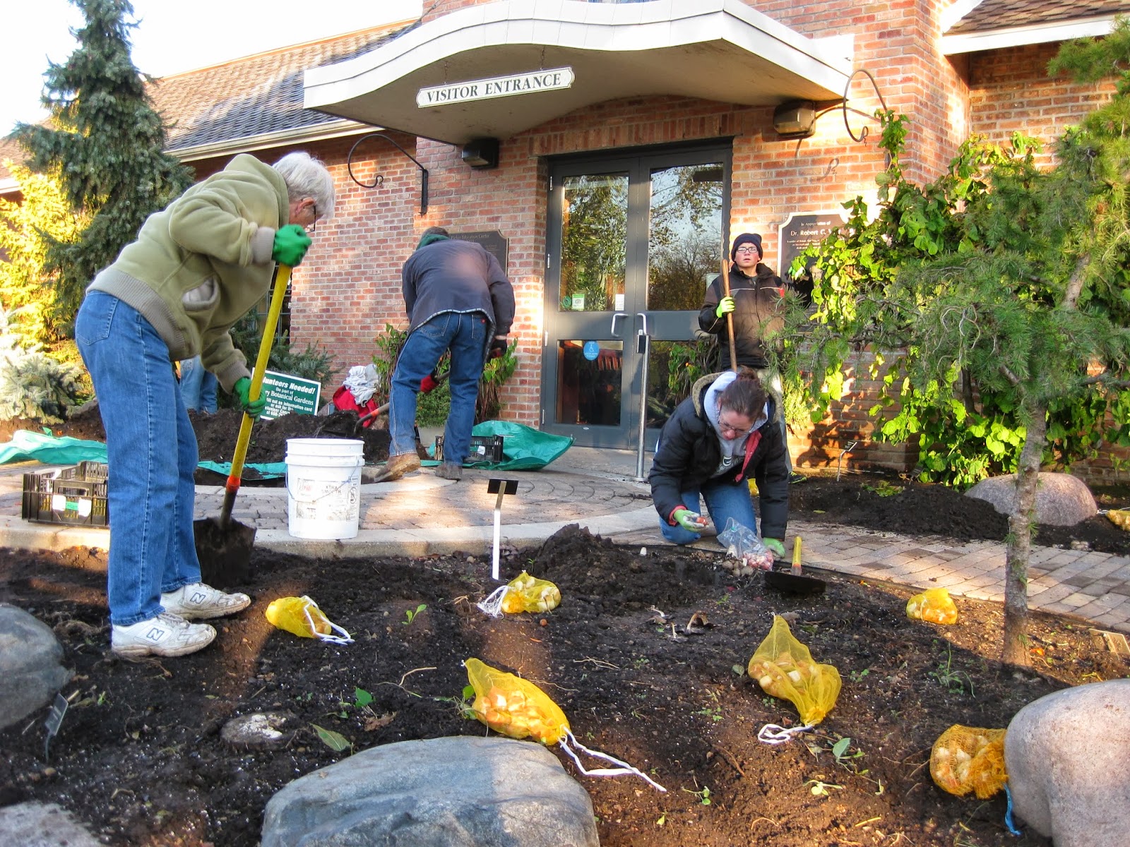 On Saturday, October 19th, we had our last Volunteer Work Saturday out in the gardens and were thankful for the strong turnout and the lack of rain! We had sixteen volunteers help with gardening tasks, planting bulbs and clearing annuals from multiple locations. Above is one of the three patio circles in front of the Parker Education Center that was excavated to plant tulips (Tulipa). Our crew planted close to 3,000 tulips in front of the main building (generously funded by the Bower City Garden Club). Below is Arnie D., one of our many volunteers that helped out. The crew also included Kay, Sue C., Deb G., Alex, Mandy, C.J., Dr. Bartz, Jody, Marv B., Mike P., Lee, Christian and Ray. Big John volunteered and was a big help with organizing the work day and helping out. Hal and Doris worked in their area and both Dr. Gredler and Bill O. came in for various duties as well. It was a very successful morning and Larry was also around to help as needed and was able to spend some time on Holiday Lights Show (HLS) tasks as well.