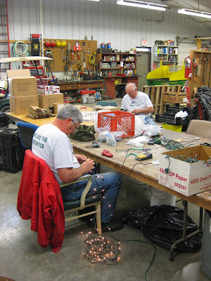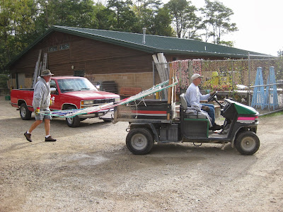 We had another great day with volunteers. Above are Gene (left) and Bob coming through the gardens with one of many loads of debris from the entrance garden. The guys did a super job of helping Cindy as did Eva (directly below). It is a monumental task to remove some of these annuals, many of which are over 6' tall with 3" diameter stems (i.e. amaranths, Mexican sunflowers, etc.). Gene and Bob can be seen two photos down with Rollie (Ron W. off camera up in the truck) unloading pumpkins for a youth education program that is always well attended and enjoyed. The third photo down shows Bev W. tidying up her garden space which will include more plant removals later in the week. Jenny was in for a good portion of the day cutting back perennials in the formal gardens and hostas in her other assigned garden area (hosta hollow). The fourth photo down shows Vern (suspenders) and Jim with one of twenty-five candy canes they've made for the HLS. We'll be painting these and adding lights shortly and they sure will look nice out in the gardens. Most of the plastic is re-purposed and will see many years of use for this event. Dick H. hauled loads to the dump, cut more aluminum label stakes and bounced between other helpful duties. Maury ran errands for us this morning and Gary continued entering data for our newest perennials that will be planted later this week. The fifth photo down shows Ron P. (foreground) and Rollie repairing lights. Pat M. was also part of this team and the fellas have repaired about 75% of the lights in need of attention and continue their great (and helpful) progress. Tom C. brought in some electrical supplies that will be vital for the HLS and Dr. Gredler mowed most of the garden today and collected plenty of leaves. We also saw Mary W., Art H., Elaine W., Sallye, Karen B., Chuck S., Bev F., Dick P. and Kris K. today. There were some committee meetings as well later in the afternoon. See further below for some shots from today.