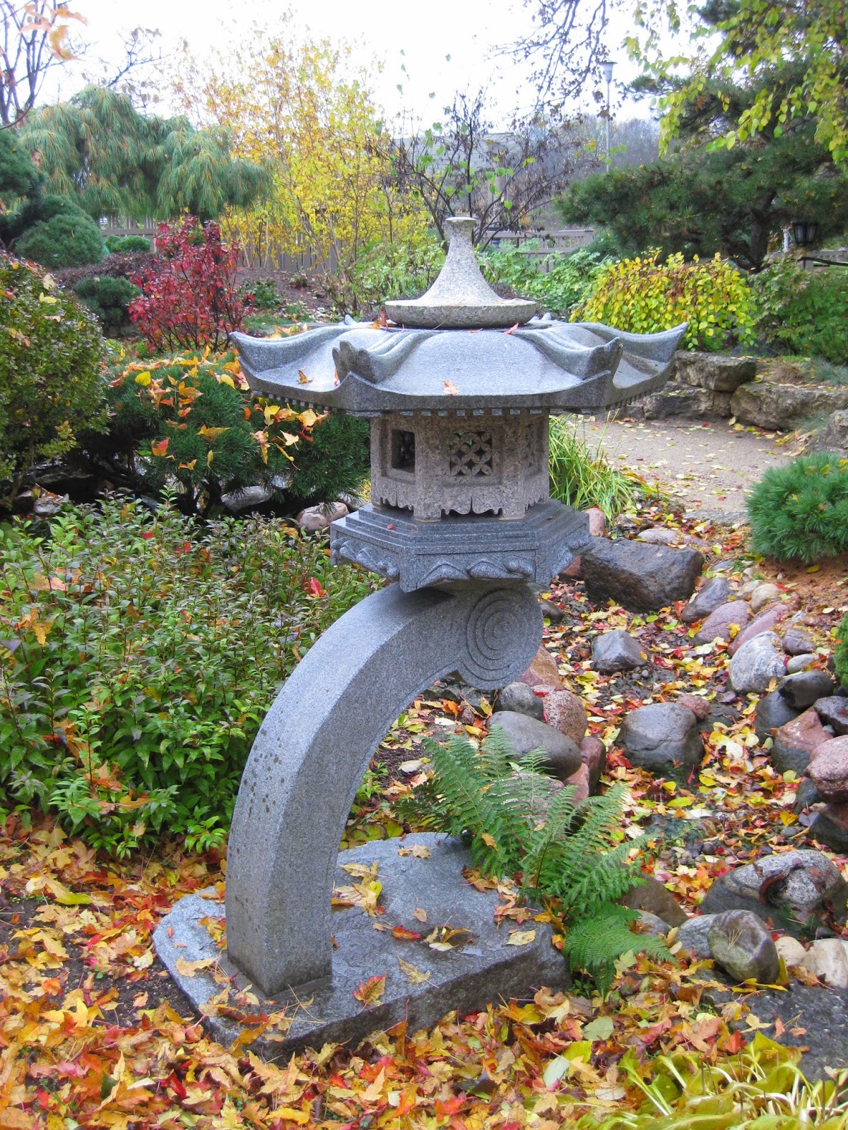 I was a bit disconnected from our morning volunteers but know that we had Maury, Dick P., Gene, Jim D., Bob C., Pat M., Ron P., Ron W., Gary S., Lloyd, Ron Y., Del, Howie, Dave T., Vern and Jim helping at the gardens. Dr. Gredler was also in for his mowing rounds. Many of the guys helped haul furniture and benches to winter storage while others shifted to leaf collection and removing some of our last annuals. Other guys helped finish processing our half gallon milk jug luminaries. The carpenters all had work and Maury ran some errands for us including returning the rental screen from our very successful Fall Symposium this past Saturday. Eva collected debris from around the gardens as well. Stan arrived in the afternoon and put more protective netting on the yews (Taxus) in the Japanese garden as there is already consistent evidence of deer!