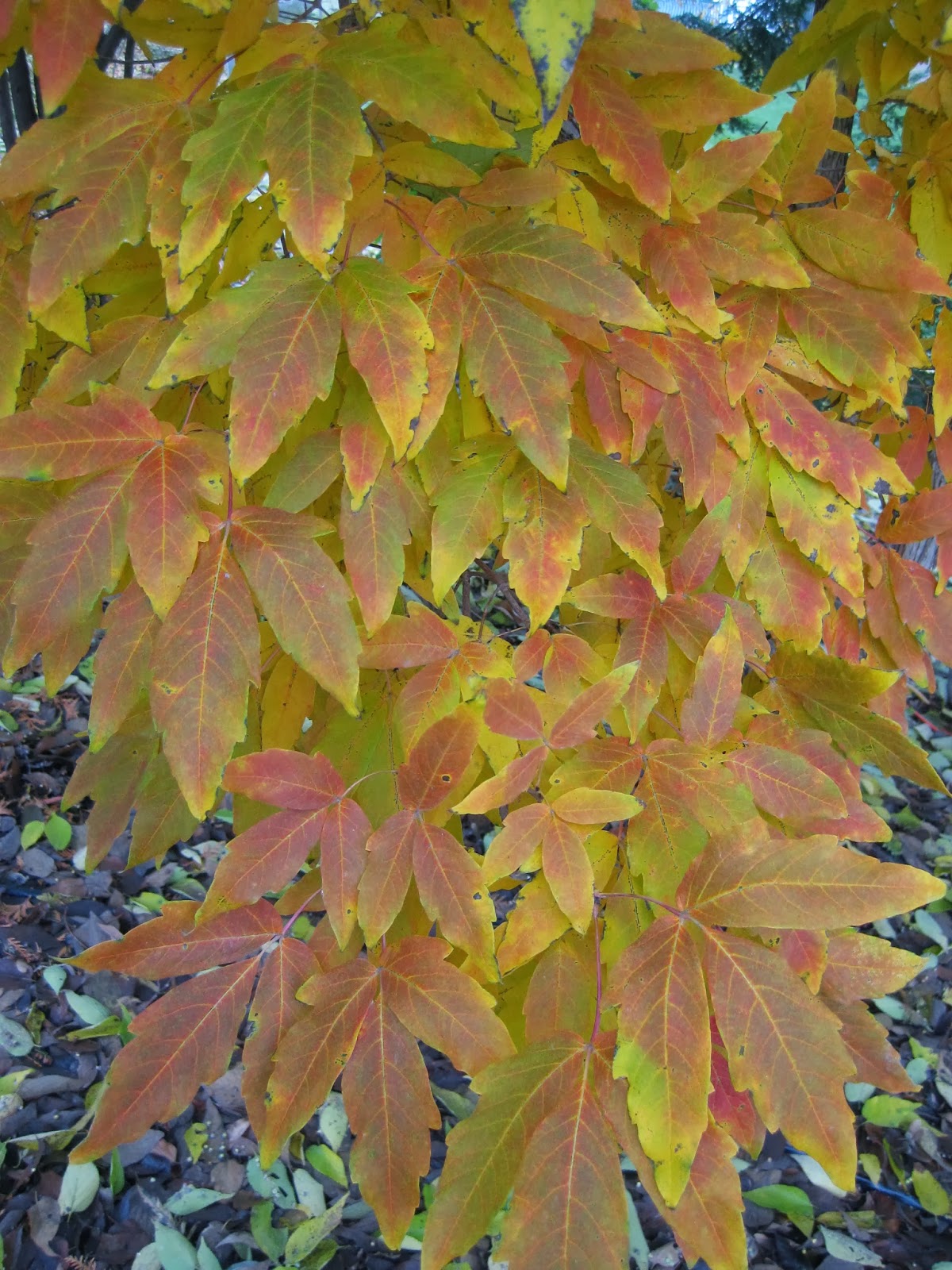 start of fall color (will get more orange) for the three-flower maple (Acer triflorum) - woody tree