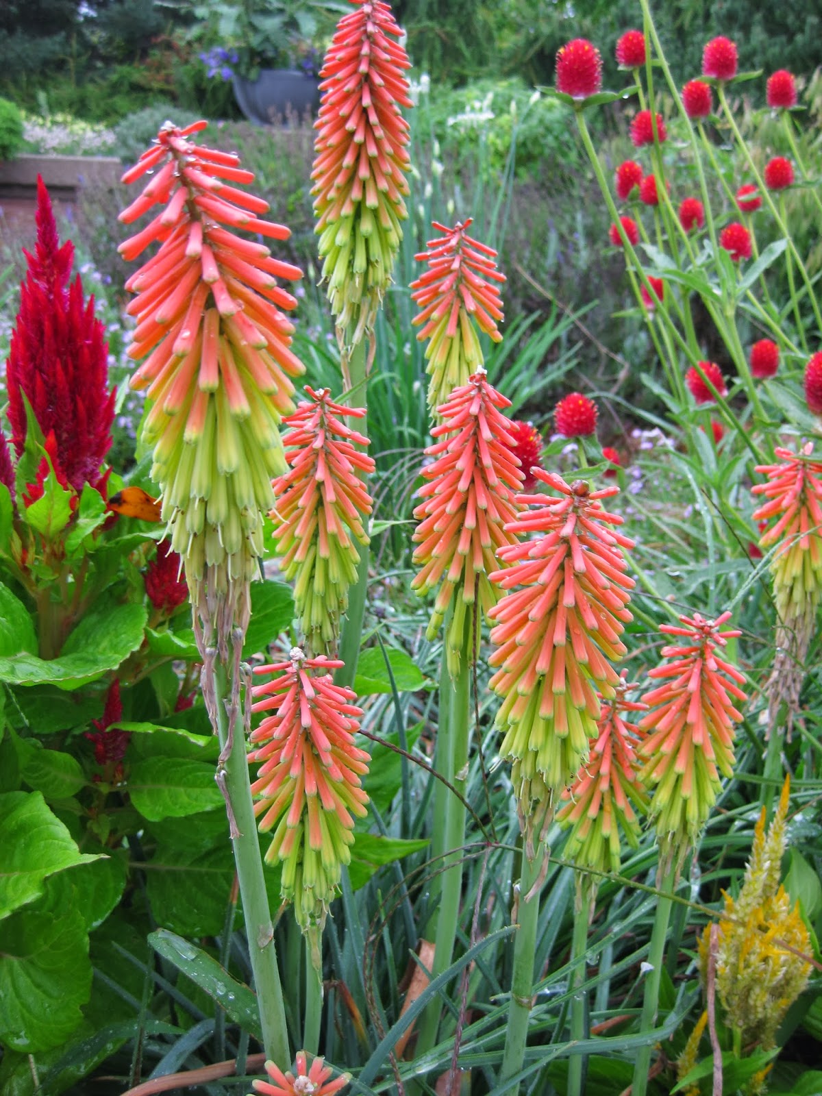 I've been recently blogging about flower architecture and thought I'd continue the trend and promote the importance of flower spires as seen in all the photos in this blog. I define a "flower spire" as a collection of flowers/florets on an upright, vertical stem that overall, has a narrow silhouette. The 'Flamenco' red hot poker (Kniphofia uvaria) above is a great (and colorful example). This plant is a tender perennial which we grow as an annual. Regardless, the basic comment regarding the value of flower spires is that they offer a vertical element that captures the eye as we examine a bed, border, composition or container planting. As our eyes work horizontally to encompass the garden, vertical elements like flower spires, upright plant forms and "non-living verticals" stop the eye and help add depth and scale to the composition. They can also make a space seem larger. Combining different flower architectures creates more interest and drama as well. Look in the image above as, aside from the red hot poker, there is a 'Fresh Look Red' plume celosia (Celosia plumosa) to the left and in the back right, the 'Strawberry Fields' globe amaranth (Gomphrena haageana) offers a spherical contribution to the composition. Using annuals and perennials with spires can create focal points and when used en masse (see the lupines directly below) can have a dramatic impact.