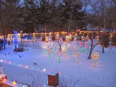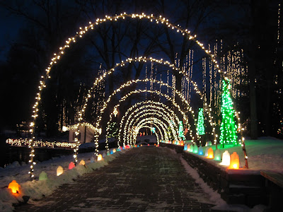 The Holiday Lights Show (HLS) opens up tonight (4:30 pm - 9 pm) for the public and will run for only twelve evenings this month. See www.rotarybotanicalgardens.org for more information on this event including event dates, entertainment schedule, sponsor information, etc. The HLS also features a model train set-up by the the Southern Wisconsin Garden Railway Society, a quilt display, refreshments, scheduled Santa stops, etc. Tonight is also "Ugly Sweater Night"! All the photos in this blog were taken by me last night as we had the show on as part of the "Business After Five" (BA5) event that had a huge crowd. I was able to walk the show for a couple of hours and do some tweaking and photographing prior to the public opening this evening. While we've posted some photos of the HLS previously, they didn't have the benefit of the snow which really adds the "icing on the cake" as seen in all of these photos. We had lots of positive feedback from guests last night and it was nice to see everything working well. The evidence of deer traffic throughout the gardens is a bit disconcerting but hopefully we'll see minimal damage by spring.