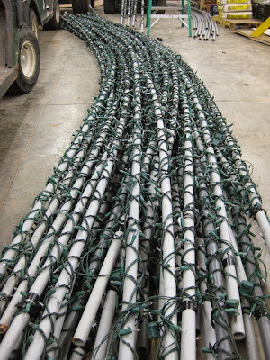 We had another productive day. Despite a forecast for plenty of snow, we haven't seen much as I type although perhaps later we'll get the 4"-7" that I was mentally preparing for after seeing the news. Pat was out in the gardens bringing in more lights from the Holiday Lights Show (HLS) and came back periodically to help process lights as well. Directly below are some luminaries that he brings in for drainage and subsequent storage. The second photo down shows some of the PVC arches that came back in for "un-decorating" by Pat, Larry and Bill. The third photo down shows just a small sample of what we're processing daily at the Horticulture Center. Bill O. was in to help Larry and Dick H. was in for some projects. Dr. Gredler came in for painting and Janice continued work on our Thomas Jefferson / Monticello themed display for 2014-2015. We also had a Garden Development & Maintenance Committee Meeting which included Dr. Gredler, Big John, Dr. Gredler, Gary, Larry H. and Maury.