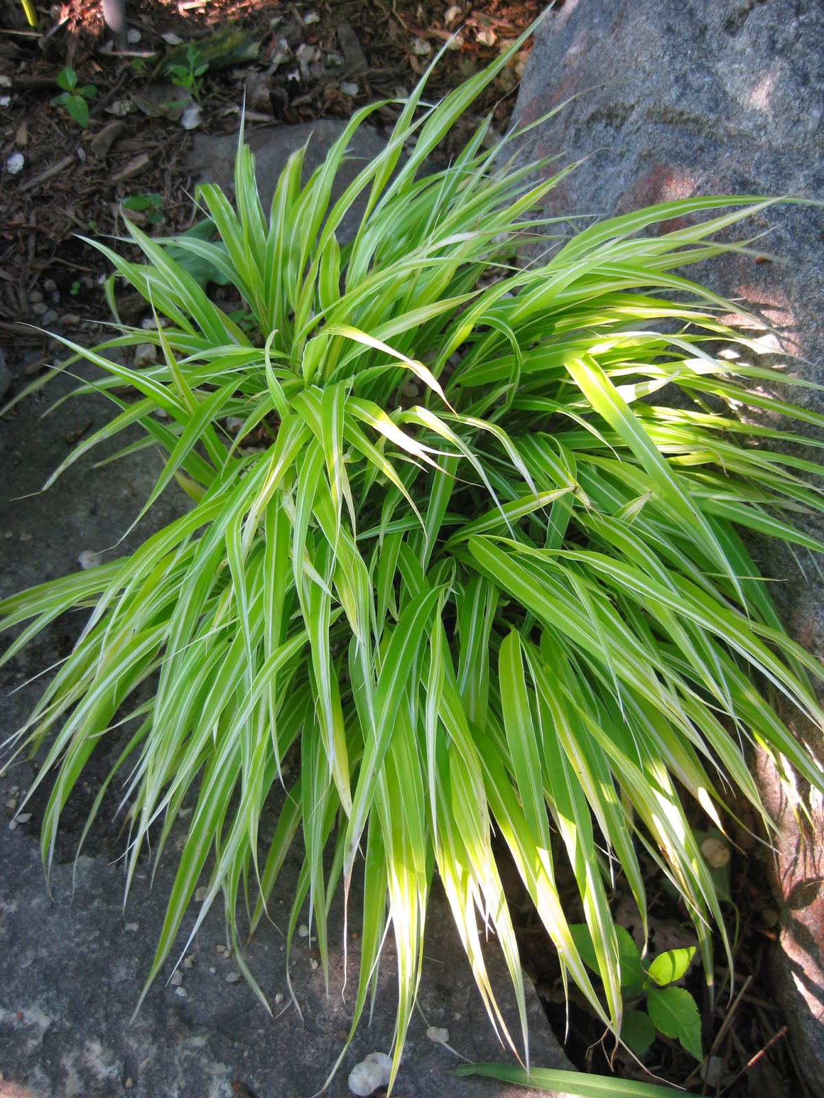 I've given many presentations on Ornamental Grasses over the years and always include Japanese forest grass, also called Hakone grass. Hakone grass (Hakonechloa macra) is native to Japan and prefers partly shaded sites and moist soils. It's important to note that some degree of lighting will allow for the best coloration of certain varieties as seen with the 'All Gold' Hakone grass (Hakonechloa macra) seen above in a beautiful foliage composition with hostas (Hosta sp.) and 'Mocha' coral bells (Heuchera villosa). Moist, well-drained soil is preferred for this perennial grass and while the variegated and golden forms prefer some shading to avoid summer scorching, the greener varieties can tolerate more sun without the "summer burning." I think that Hakone grass has been my most photographed perennial ornamental grass over the last couple of years as it is so valuable for color and texture in the shadier garden setting. There are many options out there and look further down for some more information on this exciting grass and some fun varieties.