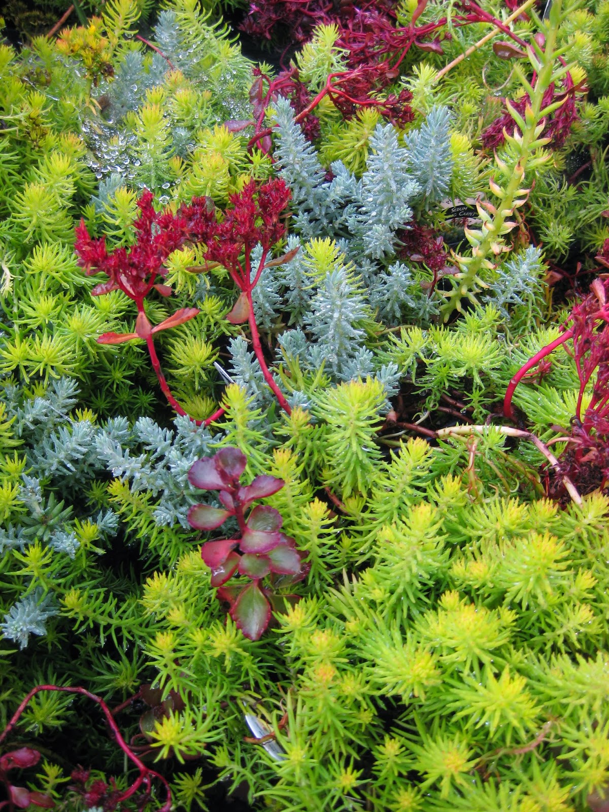 close-up of stonecrops (Sedum sp.) in a vertical planter