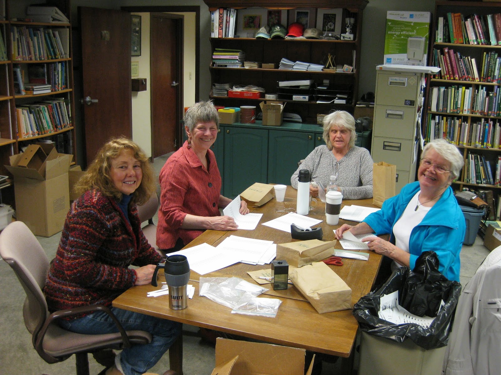 Despite the rain/snow/sleet combo today, we had a nice turnout at the Horticulture Center. Above (from left to right) are Cheryl, Patrea, Mary W. and Kay. The ladies did a great job peeling and organizing labels for the Spring Plant Sale vegetables. I was outnumbered by the females and have a new perspective on what women talk about once they forget I'm in the room. Enlightening (and a bit scary). The lists for our vegetable and herb offerings are on our website at www.rotarybotanicalgardens.org. Patrea also worked with Janice on our Thomas Jefferson Collection and Janice continued her research and efforts on that collection and the plant sale. Pat processed lots of HLS cords, lights and luminaries and Bill O. was in later to continue progress on that task. Dr. Gredler came in for some painting and we also saw Nancy N., Jumbo Jim, Stan K. and some others today. I'm hoping to see more volunteers, particularly our Assigned Garden Volunteers, over the coming weeks so we can tidy up as needed before too much emerges. Some of our inevitable winter burn on conifers can be seen below but it's always surprising to me how well (in most instances) these plants will flush new growth to replace this browning. Further below is a leaf of the thuggish garlic mustard (Alliara petiolata) which I recommend is "selectively and concisely" sprayed with herbicide as soon as you have a sunny day over 50 degrees F. Avoid neighboring plants, particularly natives, that might be emerging but a late March / early April herbicide application should kill garlic mustard before flower/seed formation. Hand digging is ok but not realistic if you have thousands of targets. At the bottom is a teaser as this elephant ear (Colocasia esculenta) is one of many tropical components I've ordered this year for our huge Jungle Garden theme!