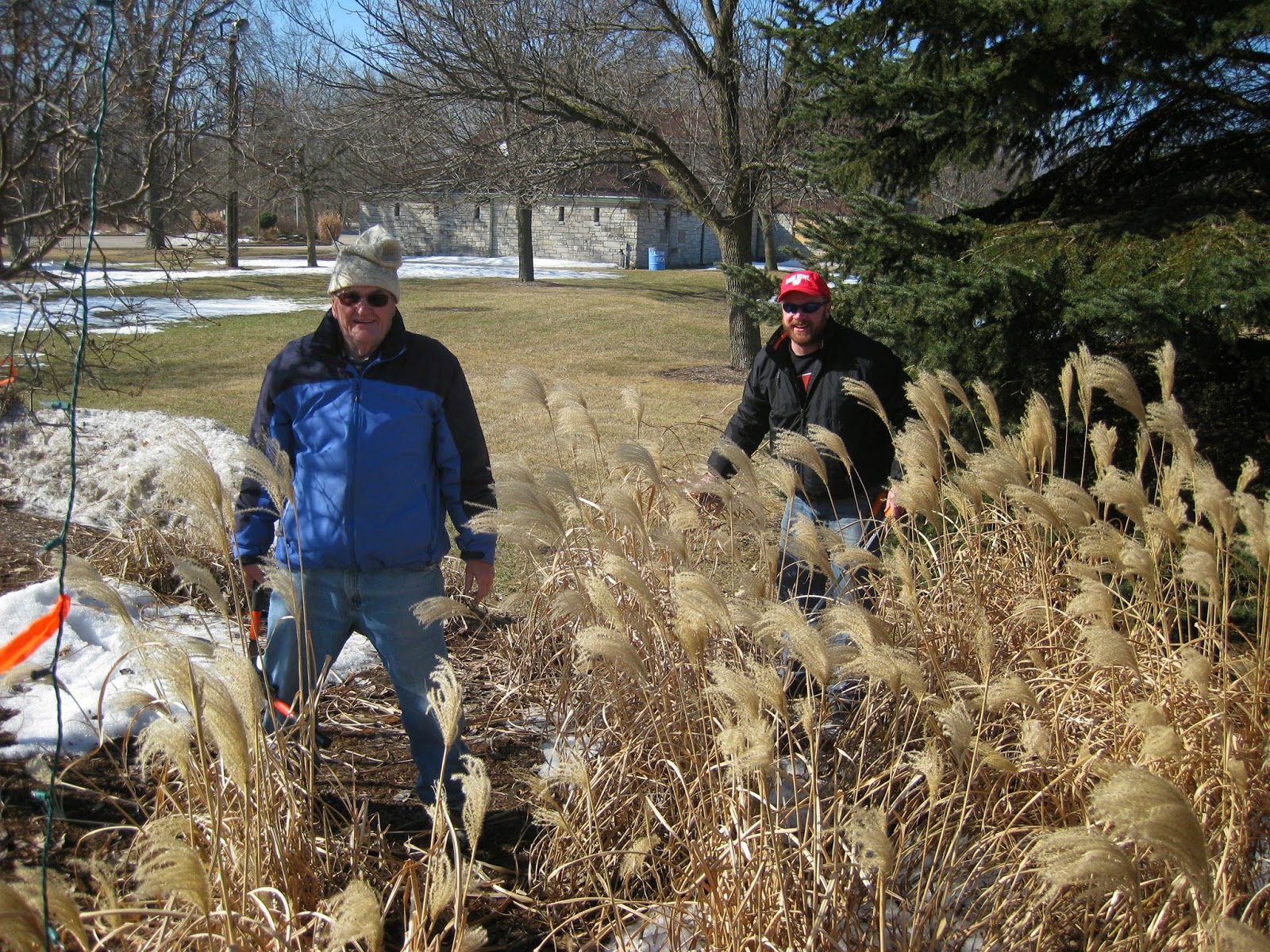 It was beautiful weather for the first day of Spring with temperatures right around 50 degrees F. This is t-shirt weather in Wisconsin and we sure took advantage of the day and saw the return of some of our volunteers as well. With much of the Holiday Lights Show (HLS) still out in the gardens, it was a nice day to bring in more elements like those seen above. I believe Larry H. brought back this load and there were some other Grumpies (Terry, Pat, etc.) out and about to pick up additional HLS lights and cords. Pat M. was processing much of these "retrieved elements" inside and was outside as well. Multiple volunteers also helped with additional cord and light processing for storage. We did have some gardening Grumpies today with Bob and Steve (red hat) seen below. The guys swept, collected pruning debris and are seen here cutting back ornamental grasses. Gene worked on staining benches while Gary B. and Dr. Gredler continued their painting efforts. Gary S. worked on new perennial labels and some computer troubleshooting for me. Dick H. was in to help out and Bill O. arrived after lunch to help Larry this afternoon. Maury was back in town and picked up the big screen for our Spring Symposium this Saturday. Big John came in to help him get this gigantic screen set up. We also saw Mary Kay, Bill O. (#2) and some others. I spent the morning delivering seeds to our growers and had some meetings as well. I'll make another seed delivery tomorrow for two of our growers near Evansville, WI. One will be growing all of our plant sale vegetables and will sow the seed as early as next week to keep everything on tap.