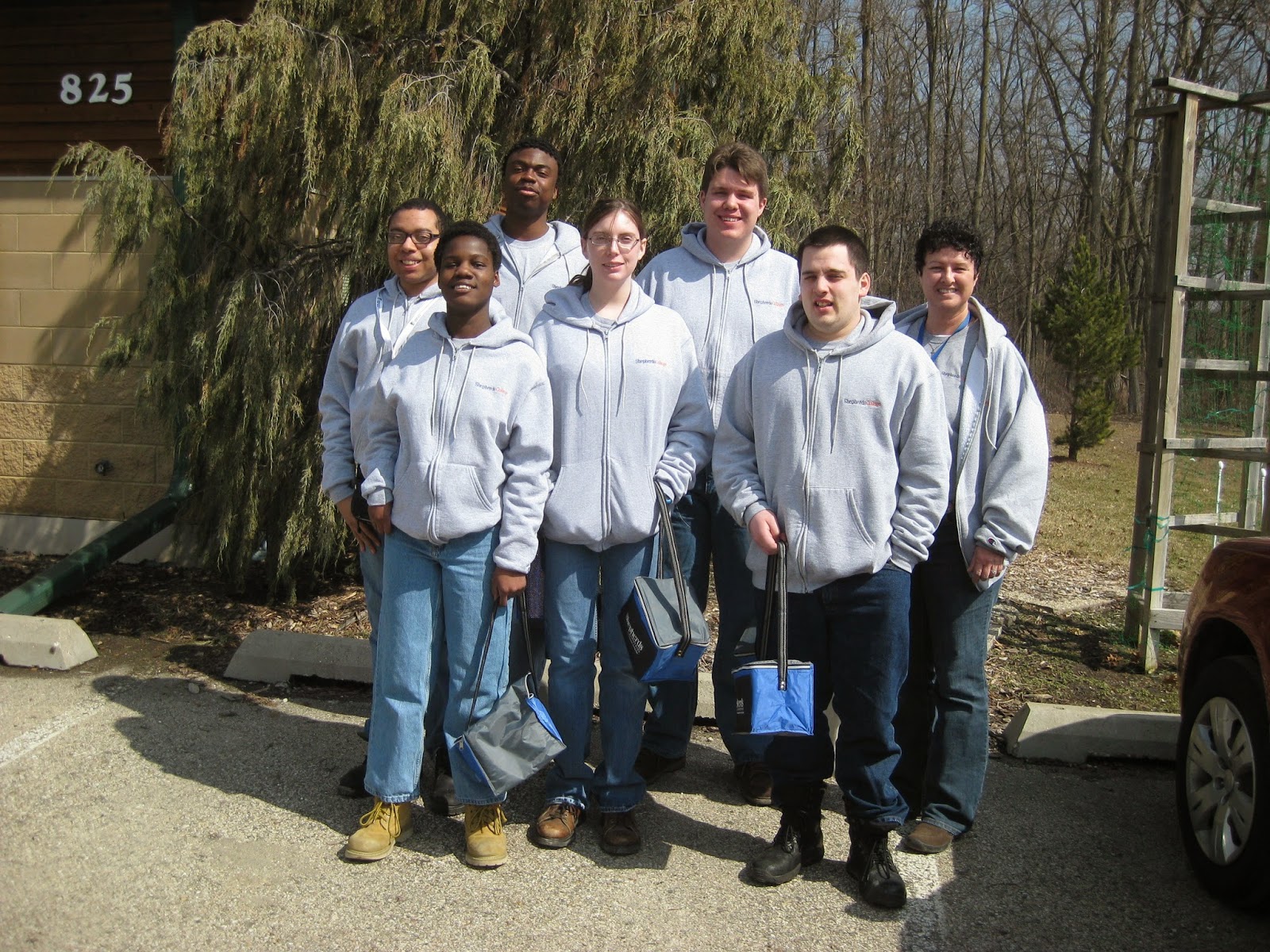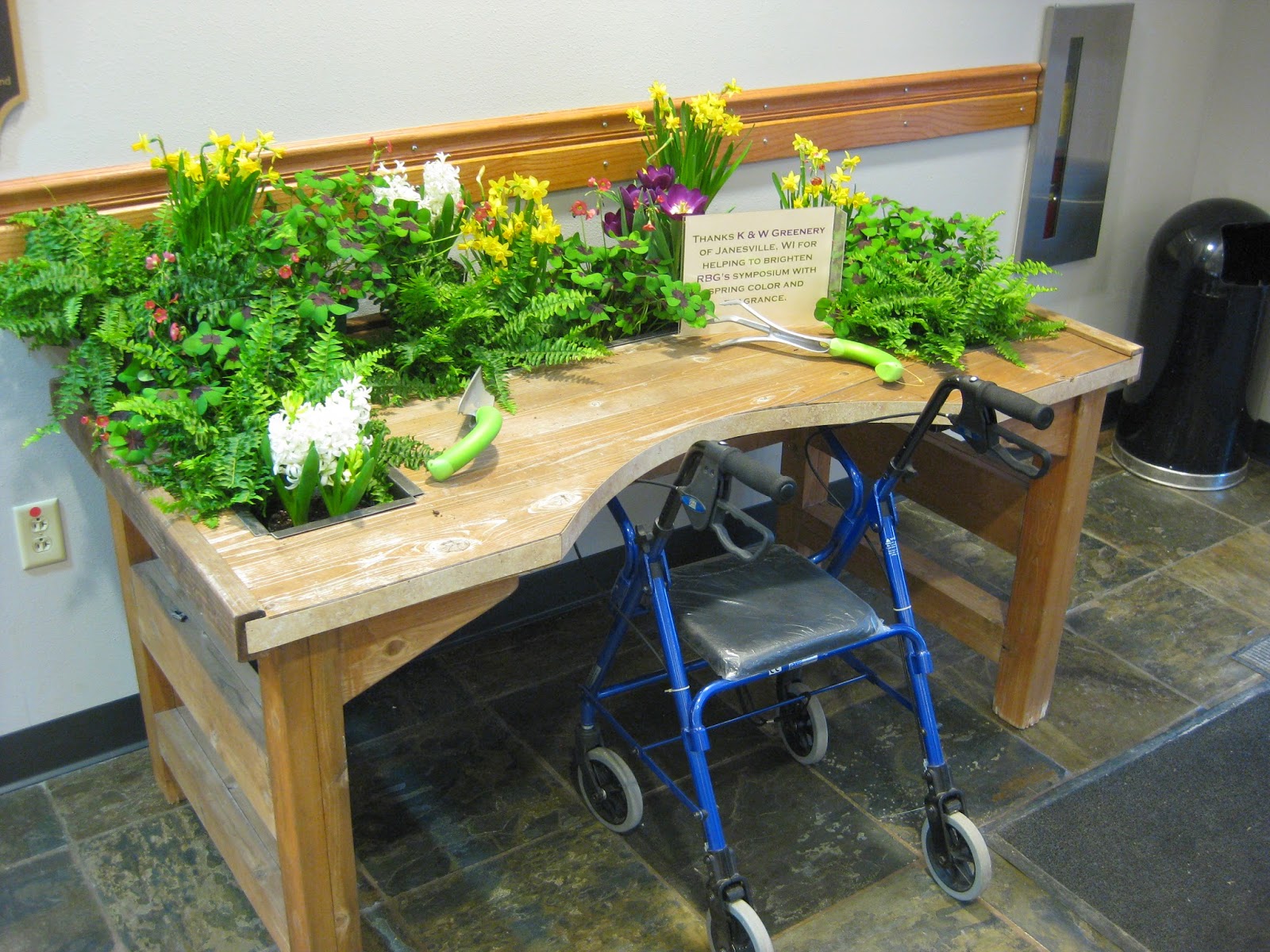 Our Gardening for Good Spring Symposium went well today. We had a crew of about 100 attendees (see above) and it was a sunny day despite being a bit chilly. The speakers (Eliza, Barb and Cindy) all did a great job and it certainly was inspiring to hear about the value of horticulture for all of us. Some attendees wandered the gardens which were a soupy mess but still enjoyable. The lunch, silent auction (thanks Song Sparrow Nursery!), raffle, etc. all went well. We displayed some of our elevated planters too including the one seen below. The plants seen in that planter were on loan from K&W Greenery (Janesville) and everyone seemed to enjoy the day. Kris K. did a nice job keeping everything running smoothly and we appreciate the help today from Polly, Mark S., Janice, Cindy, Marsha M. and Cheryl. At the tail end of the lunch hour, I did a short presentation about our history and included some promotion of our 25th Anniversary and collections this year. The second photo down shows students from Shepherds College (Union Grove, WI). Shepherds College is the country's leading three year, post-secondary educational program for students with intellectual disabilities. The students and their instructor Leslie brought plants yesterday to share/sell at the event. Students from this program, which includes a horticulture tract, also come help at the gardens every fall. All in all, a great day.