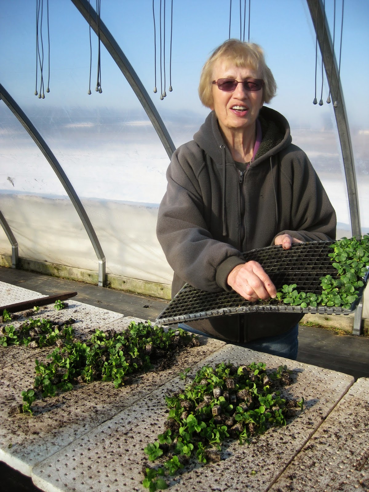 Yesterday morning I traveled to Stonefield Plant Farm (Evansville, WI) to drop off seeds for starting over the coming weeks. Patty (below) was popping out baby pansies that were being planted in four packs by an industrious crew of her helpers. I always enjoy talking with Patty and Herb and their children, Kurt and Erika are also "in the business" at their own home nurseries. The other photos are meant as a "visual fix" and show their greenhouses filling up quickly with color! Yay!