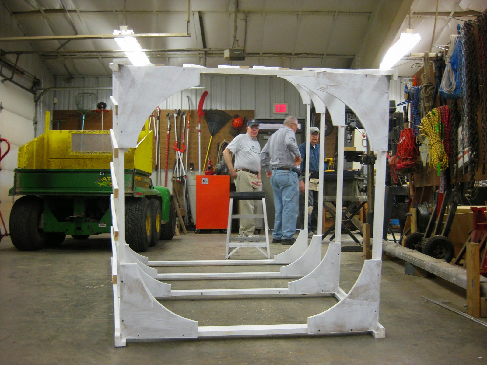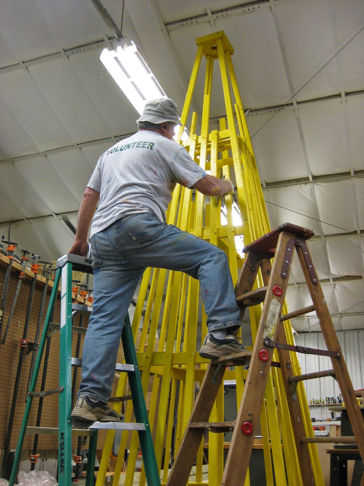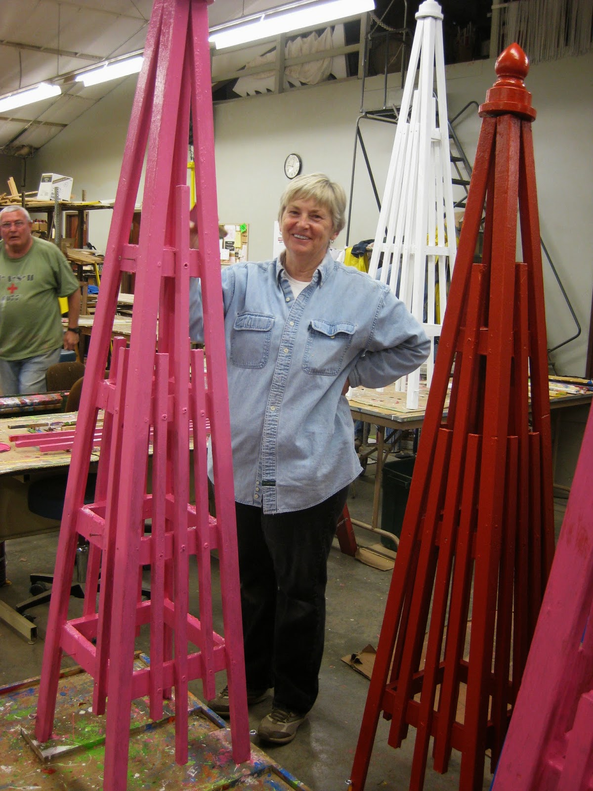 We didn't have much traditional gardening occurring out in the gardens but the Grumpies jumped right in to many projects. Ron P. and Ron R. headed out to bring in pruning debris from some recent elm (Ulmus sp.) pruning near the Japanese garden while Ron W. and Bob C. started assembling plant sale tables (see Ron directly below). Bob C. later shifted out in to the gardens and did some composting near the gazebo garden. Del was in to help out around the Horticulture Center and Dick H. ran many loads of debris to the dump. Dr. Gredler came in for more aeration/mowing between rain drops. Our carpenters, Dave, Vern and Jim, continued working on our new giant obelisk (second photo down) as well as many other projects too. Our painters included Terri (third photo down), Gary B., Bob K., and Pat M. (fourth photo down) who is currently our Head of Safety. Maury ran errands for us and Gary was in to work on labels for our 2014 Garden Art Project which includes 25 beautiful Adirondack chairs that have been "artistically rendered" and will be displayed out in the gardens soon (and auctioned off in early September). An additional chair will be featured at the Parker Education Center too! Pat C. came in for afternoon label creation and we also saw Jason and many others today as well. See further down for some colorful plant shots from yesterday and today.