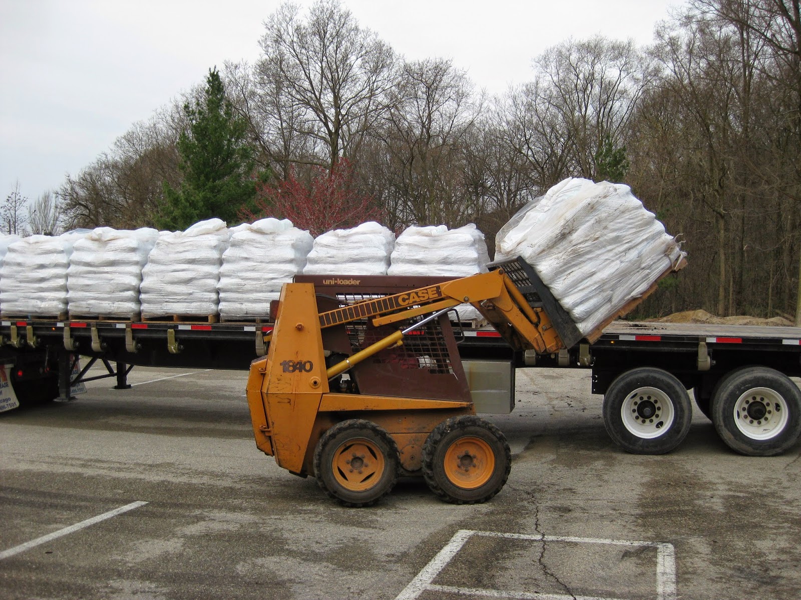 We had a small but productive grounds staff today. Janice caught up on many indoor tasks including some impressive coordination for the looming Spring Plant Sale and Tree Sale involving recruiting and organizing volunteers, labeling and other needs. These combined sales will be over the Mother's Day weekend (see our website for more details and tell family, friends, neighbors and even people you don't like). Janice also worked on potting up more trial plants and juggled plenty of projects today. Larry unloaded more bagged compost (see third photo down) early this morning so we're stocked for our Bagged Compost Sale (every Saturday at the Horticulture Center from 8 am until 12 noon). Larry also helped haul off debris from some tree pruning efforts and worked on other projects as well. Big John dug out some dead/dying shrubs, worked on preparations for tomorrow and had a busy day with multiple projects. I continue to prepare for our spring events and am coordinating efforts with all of our growers for staging our deliveries. We have only so much space and have perfected the "dance" of coordinating our spring sale with daily plant arrivals for the grounds as well.
