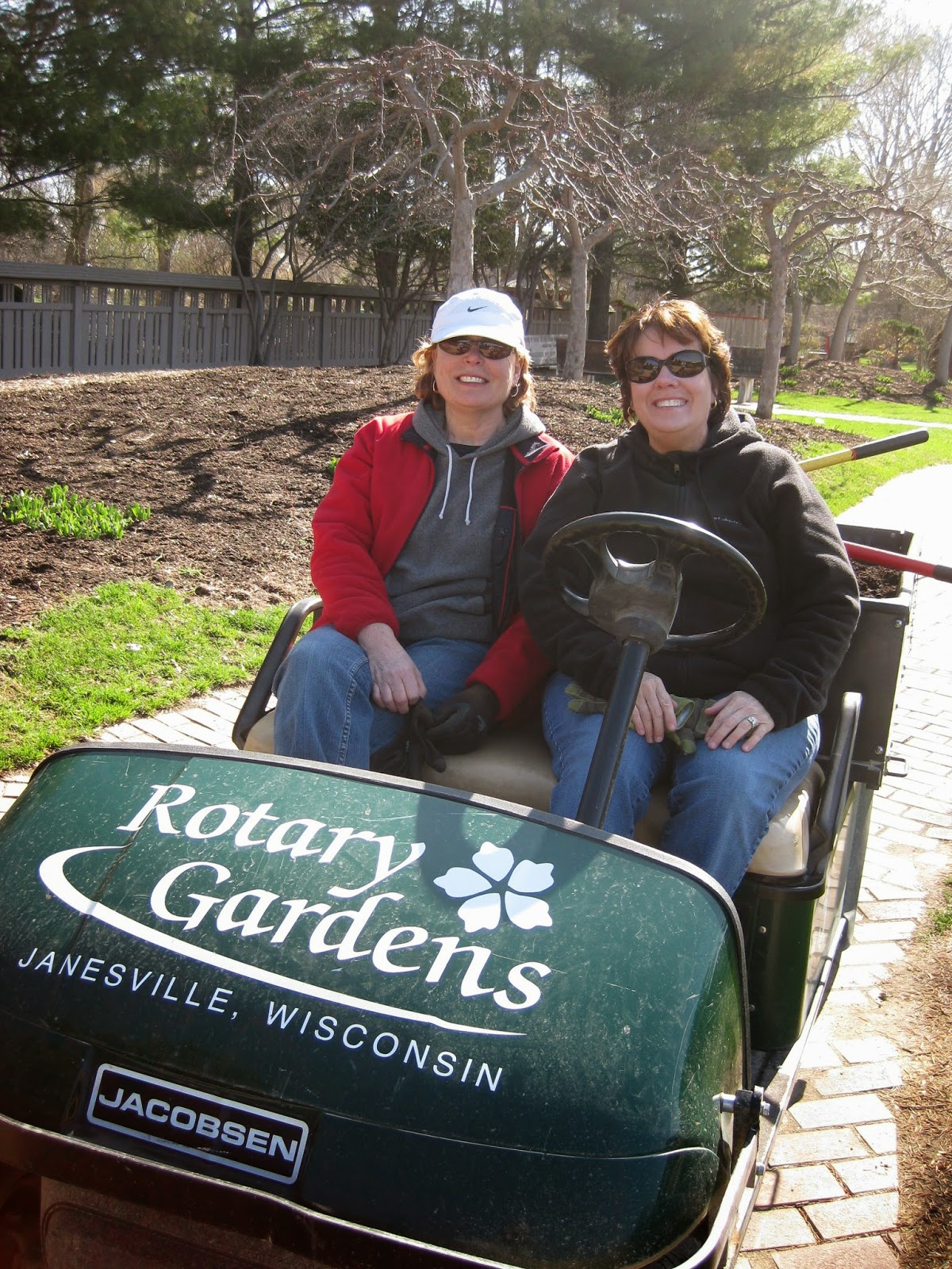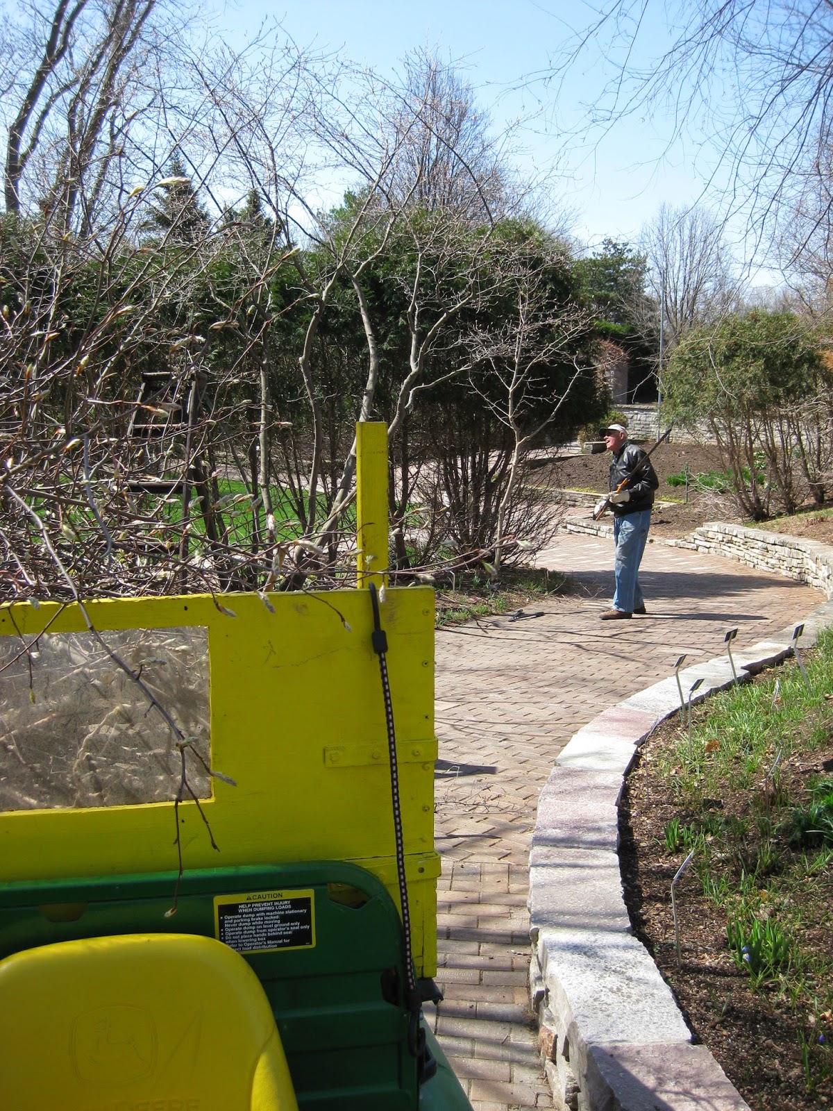 The grounds staff, as usual, had a busy day. Above is the white wind anemone (Anemone blanda 'Alba'). Cheryl started tidying the entrance garden and was later joined by Mary D. (see photo above). The ladies then shifted to the Japanese garden for similar efforts. Cindy did a nice job getting some "spring clean-up closure" in the Scottish garden and arboretum border bed. I think this has been the most comprehensive clean-up we've had and is a result of hard work (staff and volunteers) and a cool start to the spring. Big John installed/secured obelisks, staged compost, hauled/spread compost, mowed and did many other odds and ends. Janice worked on the compost sale, Spring Plant Sale, cutting display, greenhouse work and preparations for repotting a couple hundred trial plants that arrived today! Larry worked on some irrigation issues, helped load compost, took down the last of our Holiday Lights Show lights from the visitors center and kept busy with myriad tasks. Pat was inside most of the morning with painting and obelisk preparations. He was able to get outside for some pruning duties though! I helped coordinate early volunteer efforts out in the gardens but continue to be involved with special events preparations with the convergence of our Spring Plant Sale and Tree Sale. See our website for more details and enjoy other pictures from the gardens this morning (see below).