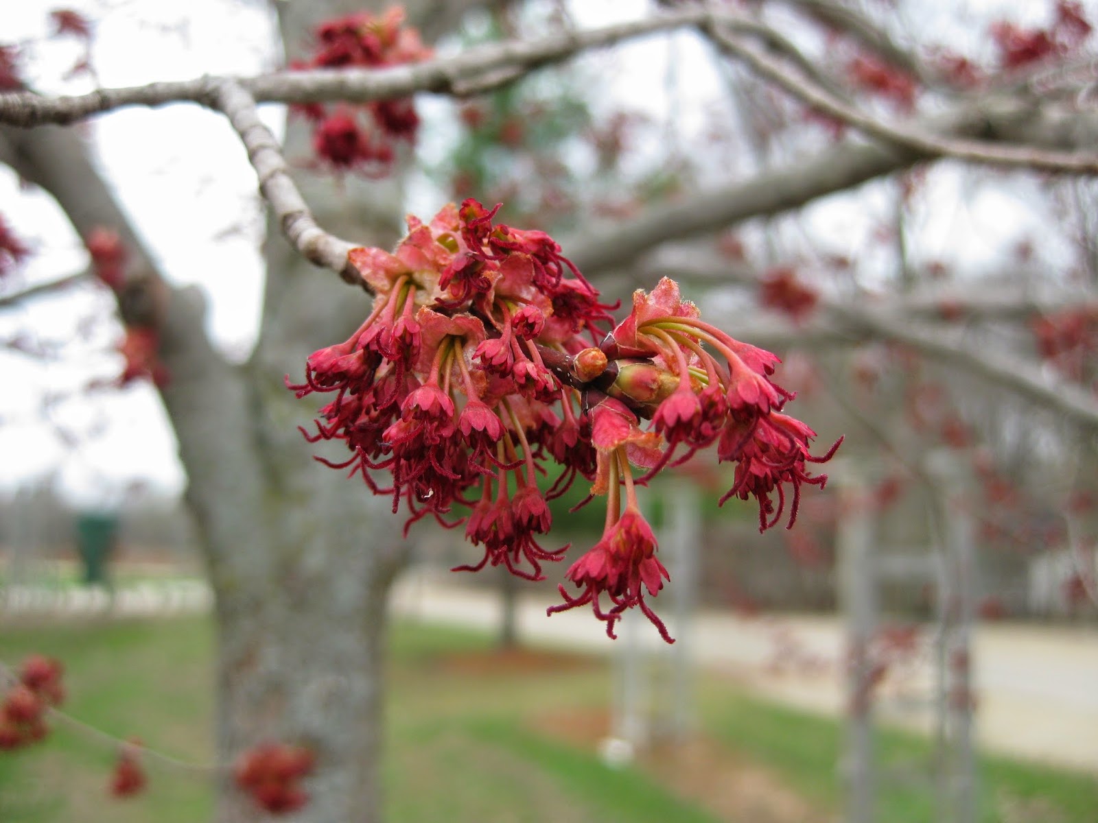 Today had no shortage of color out in the gardens and it gets better daily. I was at ground level for the shot of this 'Mellow Yellow' hellebore above. Our hellebores in general are looking great and some of the earliest woody plants are blooming including the vernal witchhazel (Hamamelis vernalis 'Sandra') seen directly below and the red maple (Acer rubrum) in the second photo down. My blog title today is "spot on" as we had a wonderful turnout of volunteers and it was a great day to garden. While the morning was a bit chilly, it warmed up nicely and was a beautiful day. We continue to see more visitors out in the gardens and with more bulbs emerging and/or blooming daily, our spring peak should still be in early May and around the Mother's Day Weekend (which also features our Spring Plant Sale and Tree Sale!).