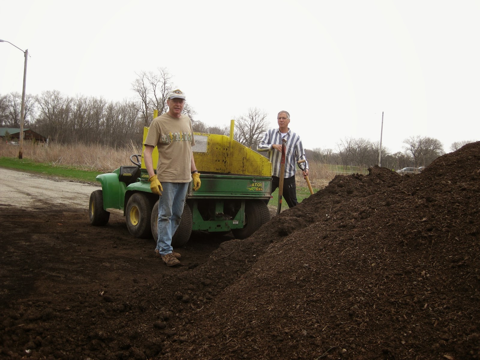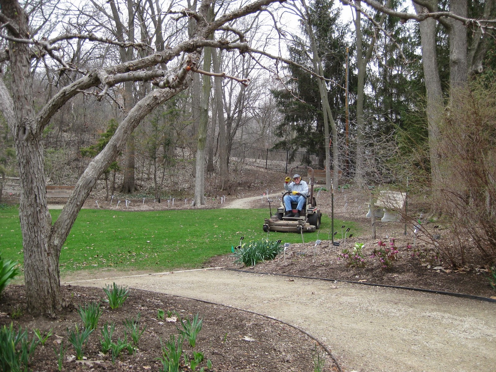 Above are Eva (left) and Shirley who started cleaning the leaves out of our streams and water features. We're hoping to have all of our water features cleaned up and flowing by the Mother's Day weekend. We had some great painting help from Pat (surprised look below!), Gene, Gary B. and Pat M. Ron Y., Dave and Jim worked on various projects including some work on the Adirondack chairs that are part of the Garden Art Project celebrating our 25th Anniversary. Ron R. and Ron W. did some work on our chairs and tables out on the terrace and later helped with other clean-up efforts. The second photo down shows Bob C. (foreground) and Lloyd removing bricks from a path in front of the Parker Education Center. This path and two others will be redone with concrete in the coming week or so. The guys did a nice job and got some help from others as well. Dick H. took many loads of debris to the dump and Larry H. and Kevin C. (third photo down) worked on composting the remainder of the sunken garden. Rollie was in to help and Maury ran more errands for us. Dr. Gredler (fourth photo down) was out mowing and enjoying the fresh air after four months of painting in the Horticulture Center. Bob K. helped with some electrical issues and we had many more visitors as well including Jason and Bill O. Some other flower photos from today can be seen further below.