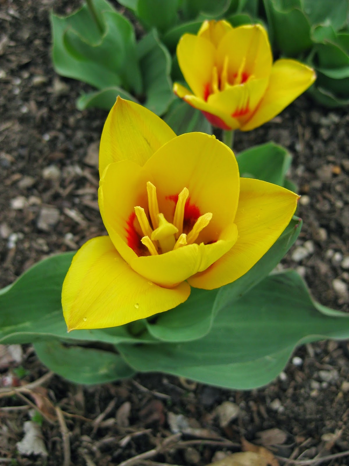 The threat of rain materialized right around the lunch hour although we had some great progress out in the gardens before the skies really darkened. The afternoon drizzle was welcome. The Easter weekend was quite sunny and warm and the gardens responded with more bursts of color like the bloodroot (Sanguinaria canadensis) seen above and the early 'Stresa' tulip (Tulipa) seen below. Our daffodils (Narcissus) are really filling out nicely (see second photo down) and can be seen throughout the gardens approaching peak. I had my camera with me all day and was able to capture many of these early bloomers and much of our volunteer efforts as well (seen further down).