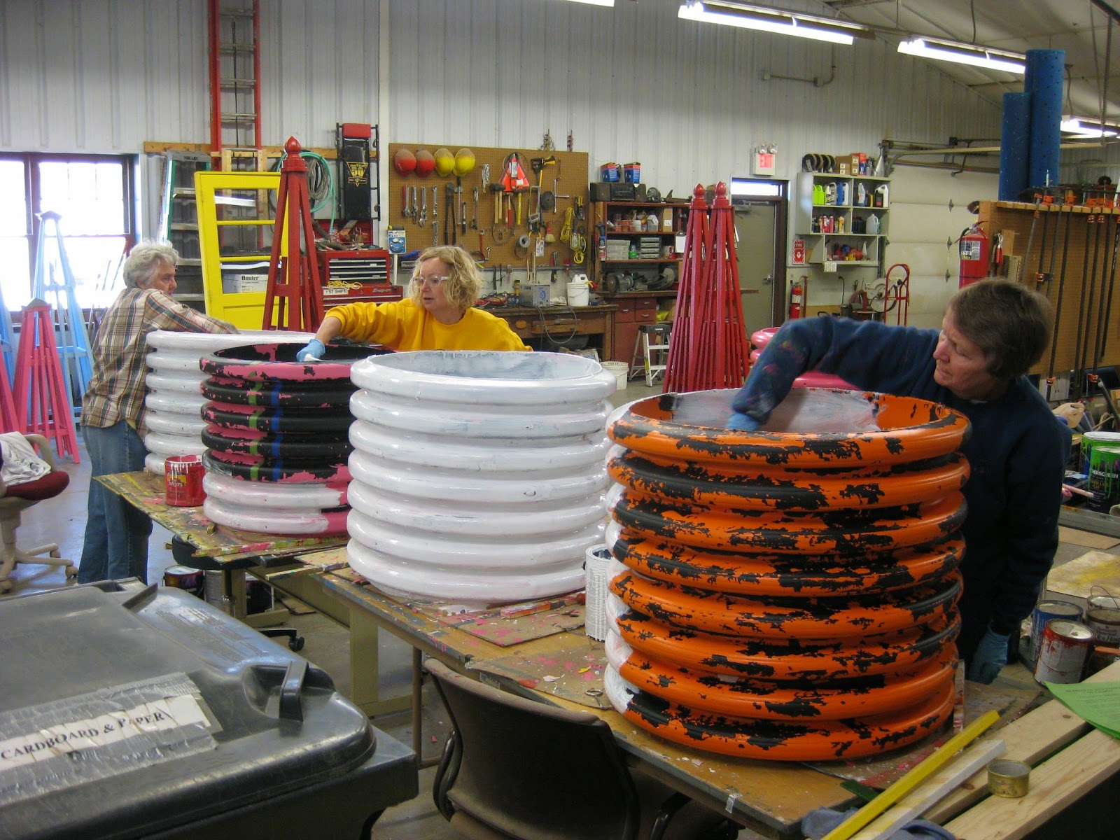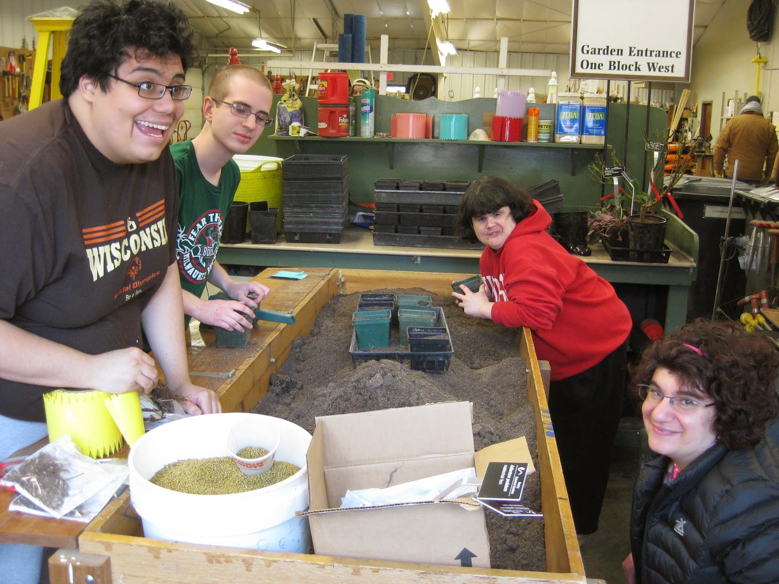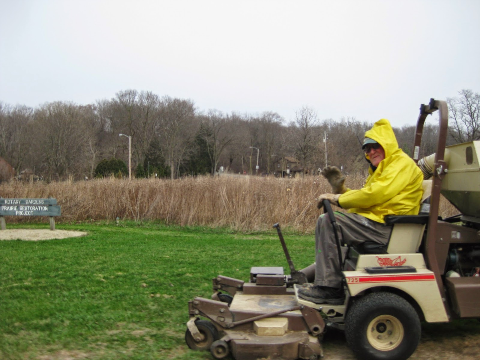 You know spring is here when Dr. Gredler (above) gets on the mower. He took his "ride" out for a spin today after some painting and tidied up our larger turf areas (which needed it). We're not officially mowing yet but will do touch-up as needed until the turf really gets going. The prairie behind Doc was burned by the City of Janesville Parks Dept. staff today too. Our morning volunteer crew was substantial. Below are Patrea (left) and Kay who did a nice job with Spring clean-up in multiple areas. Eva was out there doing similar work and Kathy P. worked with Cheryl in the entrance garden with additional clean-up efforts. Larry H. (second photo down) put in some solid time with mulching the remainder of the main parking lot. He did a very thorough job (which surprised all of us). We had some great painting help today too. The third photo down shows Jessica (left) and Leslie, who along with Joe (off camera), continue painting various objects this morning that will be going out in the gardens soon. They were replaced by our afternoon crew (fourth photo down) which included (left to right) Myrt, Mary (welcome back!) and Gena. Nancy N. was off camera working on painting obelisks as well. Jumbo Jim brought in four RECAPPERS to help in the Japanese garden and Maury ran errands for us. Janice worked with our Chestnut House volunteers (fifth photo down) today as they potted up more plants and moved plants potted by Cindy (sixth photo down) to the greenhouses. We also saw Dick H. and many others today. I had a long meeting so inevitably missed some of the "comings and goings."