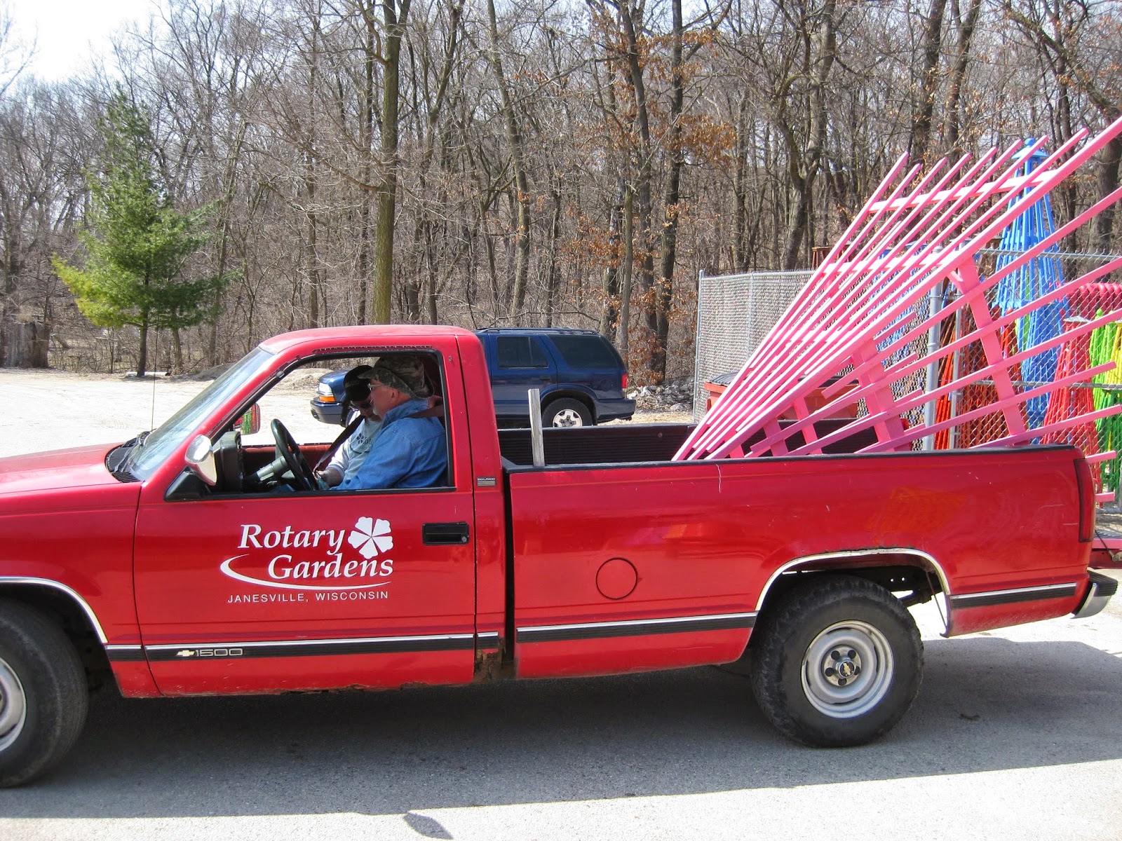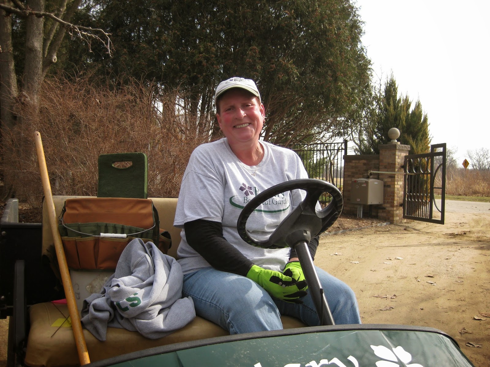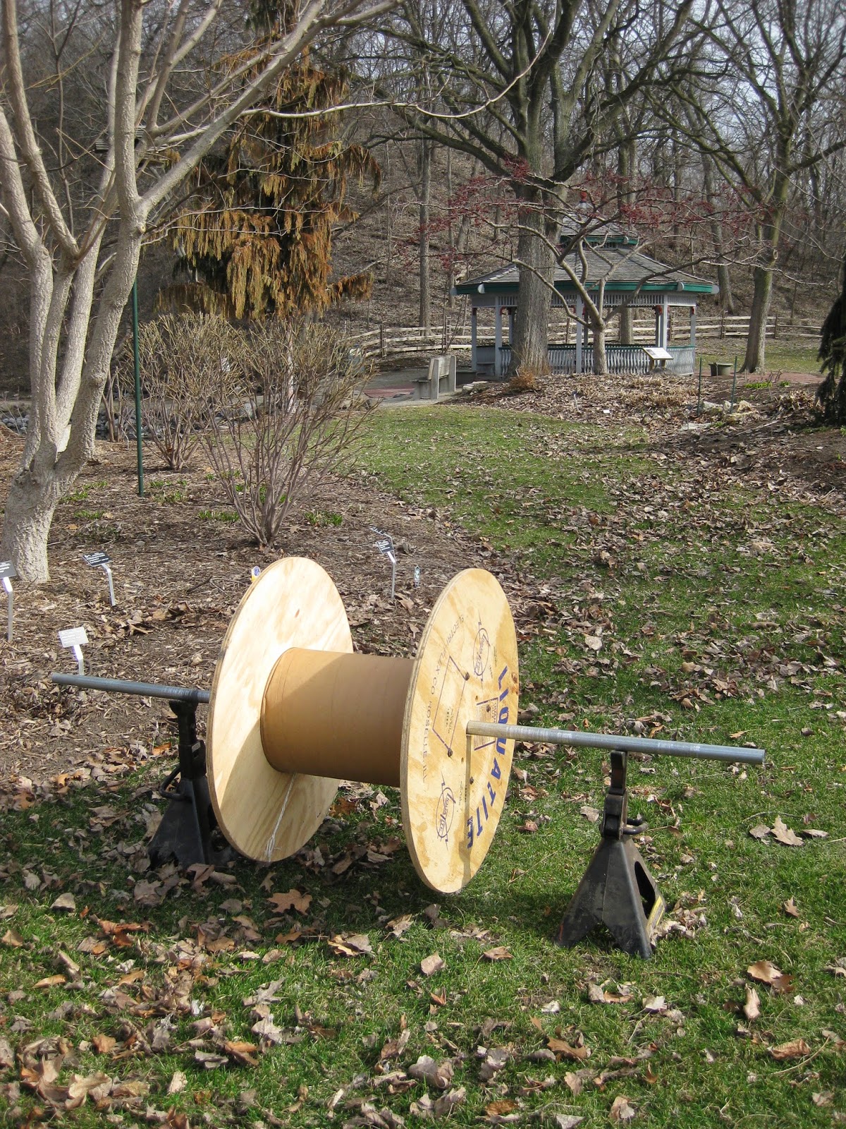 We had a solid crew out in the gardens. It was nice to see Shirley H. (above) back in action, She helped tidy the gazebo garden with Cindy (directly below) who has also returned for another year of "reimbursed abuse" as a grounds staff team member! :) Eva was also out tidying up in the Japanese garden and Stan K. was in later to continue pruning in that garden space. Ron W., Ron R., Larry H. and Ron P. all worked on hauling our memorial benches back out to the gardens and securing them in place. This is a sizeable project as we have close to 50 benches to store over the winter and ultimately get back in position. The guys will finish later this week. Bob C. was out collecting debris and Bill O. came in to help Larry with various tasks. Larry also worked with Bob K., Dick H. and Rollie with rolling up our temporary power cables from the HLS out in the gardens. The second photo down shows their rolling "spool" and contraption (courtesy of Bob K.). It took all four guys to get these long cords brought in efficiently and stored safely. Vern, Dave and Jim worked on various carpentry projects while Gary B. continued painting windows and doors for one of our displays. Gene helped Gary as did Bob K. later in the morning. Gary S. worked on labels for the Thomas Jefferson Collection (see further below). Maury ran more errands for us and Pat did a nice job continuing with some painting efforts. We also saw Tina B., Janice, Hal R., Jean S., Dave G., Del and many others. Big John and Terry cut back our 'Flame' willow (Salix hybrida) patch to encourage new growth and helped secure our pink pyramids and obelisks in the entrance garden. It was a very productive day and I'm sure the weather helped with morale too!