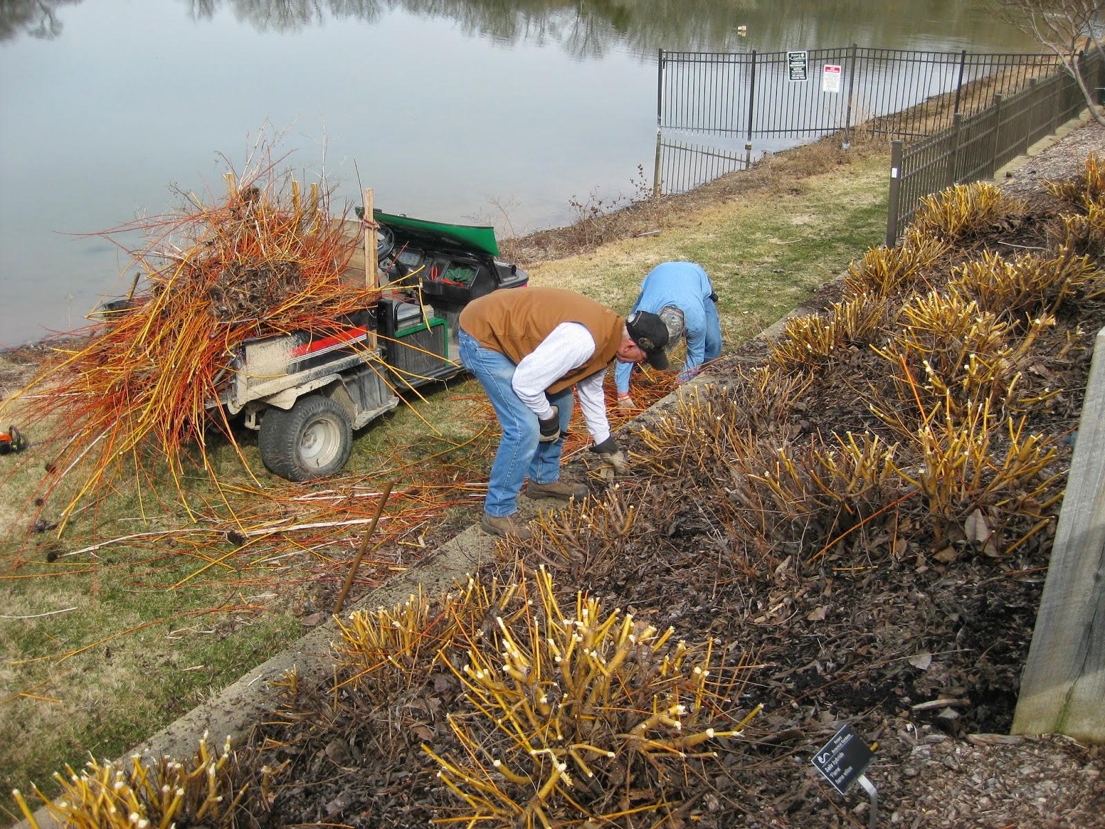 Terry (left) and Big John cutting back willows (Salix 'Flame')