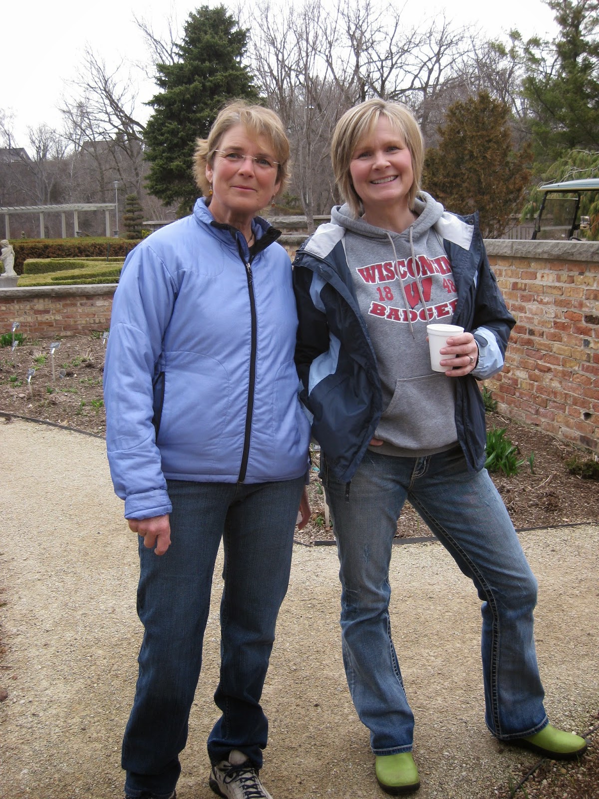 I went in to work this morning to meet some of our volunteer painters who graciously donated some of their weekend to help out. Above are Bev (left) and Tammy who did a great job not only repainting these culvert pipe planters but touched up many other objects as well. Larry and Bill were in to get our riding mowers ready and work on some other projects. Janice came in to train our volunteer Lois for the Spring Compost Sale (8 am until 12 noon every Saturday in April and May) and we sold close to 200 bags this morning. Pat M. helped load compost for customers but also worked on myriad other projects in between loading like painting, carpentry, etc. Dr. Gredler came in for obelisk painting and we saw many others as well. The Janesville Area Herb Society had their meeting at the Horticulture Center this morning and it looked like a good crowd. This group has maintained our herb garden at RBG for many years and we look forward to their continued involvement with the gardens. Below are Mirjam (left) and Marcia, both RBG volunteers, who came by this morning. I took them on a mini-tour as they were interested in maintaining their own section of garden and ultimately selected the English cottage garden (where this photo was taken). It was a busy day although after the morning rains, it turned out to be pleasant overall.