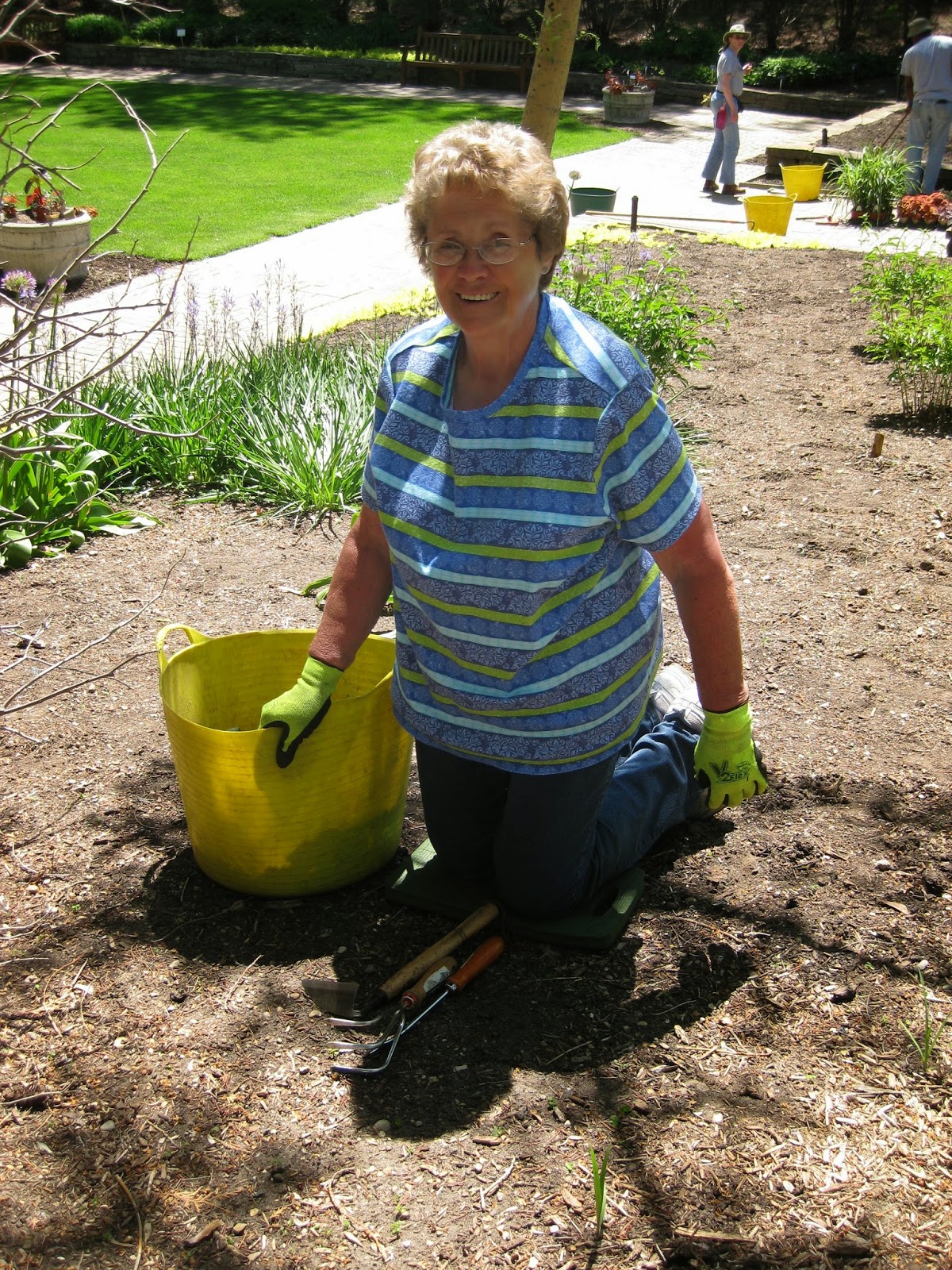 Good volunteer help was readily available today. Above is Kathy P. who is a relatively new volunteer this year and has really been a great addition to the team (she bakes yummy cookies too!). Kathy and Eva weeded in the Nancy Yahr Memorial Children's Garden and shifted to the sunken garden which has become "weed central" over the past week or so. Roy and Mary (next photos down) did a nice job tidying up their portion of the shade garden and installed quite a few plants as well. Their space will be one of the most colorful locations in the garden by mid-summer. The third photo down shows Ron K. in the woodland walk where he tidied and also installed another 50 or so perennials and watered them in nicely. He is a heck of a worker with plenty of real estate to maintain which he does well. The fourth photo down shows Don and Pearl weeding their garden area which they'll plant in a couple weeks once the bulbs finish up. They are known for their great teamwork and always matching their shirts (both at the gardens and elsewhere.....creepy). Karen M. tidied in the Japanese garden and both Dr. Gredler and Bill O. did their mowing rounds. Many members of the Janesville Area Herb Society were out planting the herb garden sections. Bob K. continued progress with our electrical service for the new fountain. Kay was a huge help in the Thomas Jefferson Collection with planting and watering. Darcie O. helped Janice coordinate work with student volunteers from Shepherds College (see further below). Maury ran errands and Mary Kay T. helped in our reference library. We also saw Dr. Yahr, Chuck S., Bob C. and many others today.