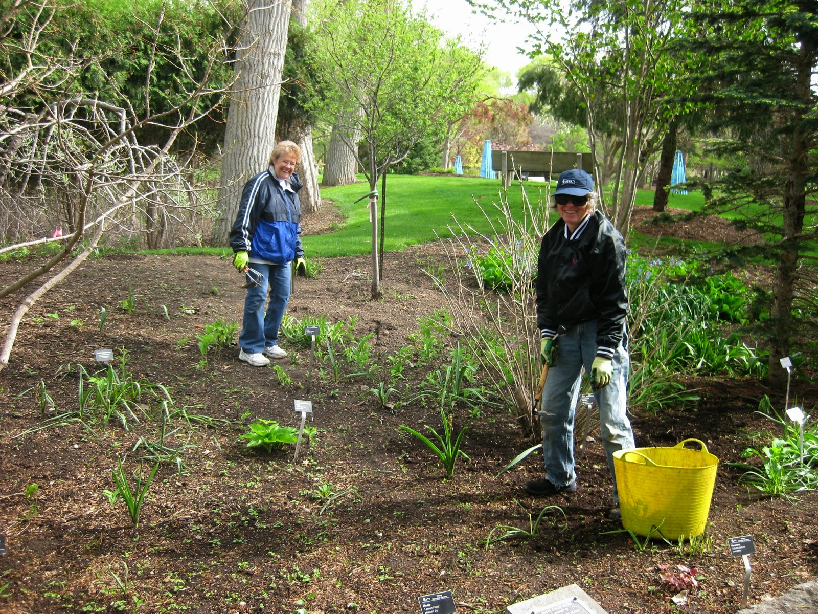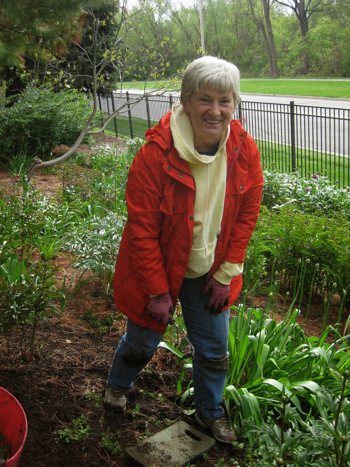 We had a great volunteer turnout today. Dr. Gredler and Bill O. were in for their riding mower rounds and did a very thorough job of tidying up the turf for the weekend. Dick H. came in for some debris runs to the dump and worked on some other indoor projects as did Vern. Kay (above) paused to smile in between some significant weeding and turf edging. She does such a nice job (smiling too!). Below are Kathy (left) and Eva weeding in the Woodland Glen garden (formerly color rooms) which had become very weedy. They did a great job which is typical (and expected) and are a true dynamic duo. Across the path from these ladies was Terri (second photo down) who targeted weeds in our huge peony bed. Our weeding efforts in this battle zone continue after many years and today Terri made great progress. Lisa I. came in to talk about the daylily (Hemerocallis) collection and picked up some new labels. We also saw Maury F., Dr. Yahr, Larry H., Glenn D., Mary Kay T. (worked on the reference library) and many others.