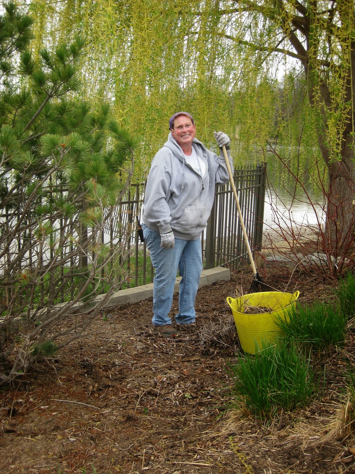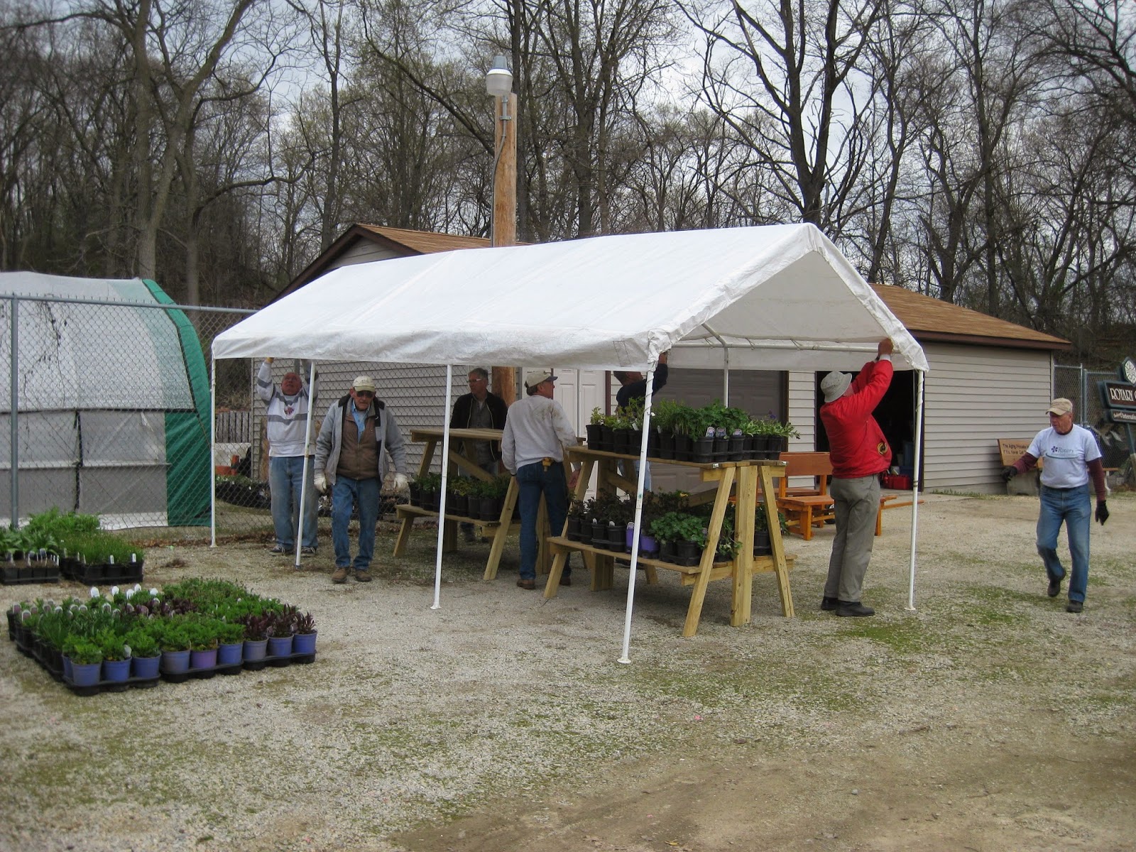 We had an energetic and efficient group of volunteers today. Above and below is our talented tent crew (Ron W., Larry H., Ron P., Jim D., Bob C. and Gary B). The guys set-up seven tents in quick succession and have this down to an art form. Kevin was nearby preparing buckets for our signs and helped out with the unloading of deliveries as well. Some of the guys headed in to the gardens for composting later in the morning. Dick H. ran to the dump and helped with other activities and Dr. Gredler came in for his mowing duties. Dick P. and Rollie made a road trip to pick up memorial bricks (near Milwaukee) and Maury helped with a wide range of activities. Pat M. worked on one of his projects and our carpenters (Ron Y., Vern, Dave and Jim) continued work on the second giant obelisk which is ready for painting. Eva went out for garden clean-up as did Tina B. (second photo down). We also saw Denise, Mary F.P., Chuck S. and many others today.