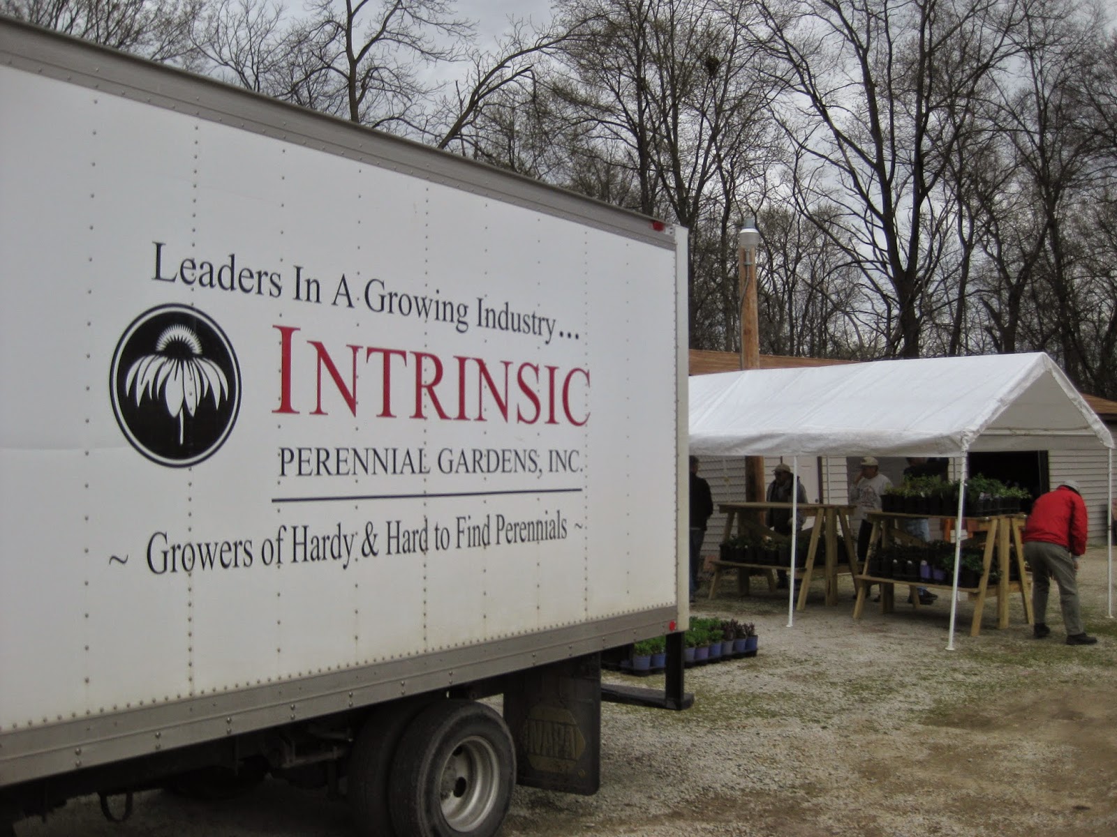 Today was pretty intense with a wide range of activities occurring, particularly in the morning. Nice shot above of a pasque flower (Pulsatilla vulgaris) fully open this morning in the alpine garden. The threat of drizzle didn't materialize thankfully so we were able to prepare for the Spring Plant Sale and Tree Sale this weekend, accept/process three deliveries and even get some gardening done too! There were some other activities happening at the gardens this morning including the pouring of concrete sidewalks in front of the Parker Education Center and continued maintenance on our water features with the goal of every thing up and running by Mother's Day weekend. Below are some images of our deliveries this morning which included woody shrubs and two loads of perennials. Tomorrow we'll see most of the vegetables and herbs arrive with Wednesday being the last day for "incoming product!" We'll have a wide range of plants for everyone and thanks to both staff and volunteers that helped with the myriad set-up details, unloading and staging efforts.