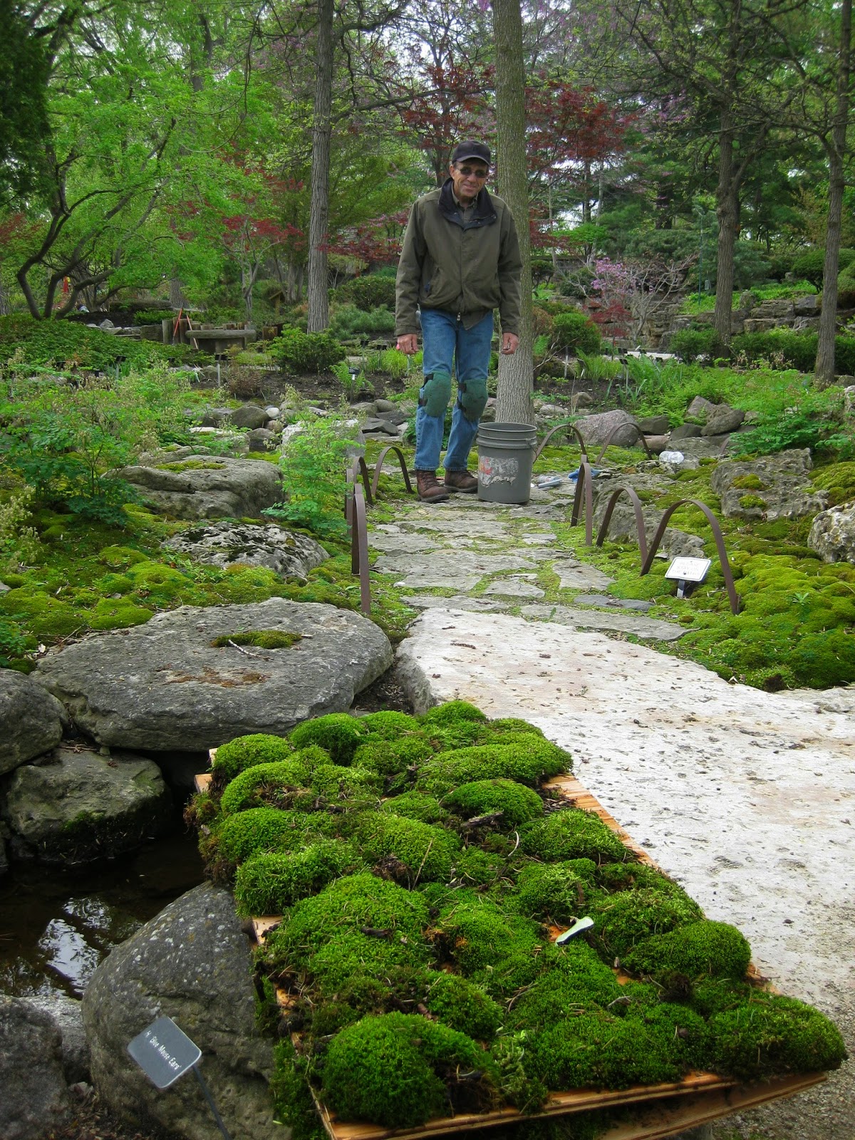 We had a great turnout of volunteers today and Wednesday continues to be one of our best days for garden volunteers. Above is Dr. Gredler doing his combination of mowing and aerating at the same time. He does a nice job and donates much valuable time to the gardens. Below are Magda and Marleen who did a great job in their assigned garden area with clean-up which will be followed soon with new planting. They never miss an opportunity to pose for the camera... Ron K. (second photo down) continues to tidy in the woodland walk garden which is at spring peak right now and looking quite awesome. Eva and Kathy (third photo down) did a superior job tidying in the gazebo garden which really benefitted from their attention. Kay was a whirlwind again today with work in the shade garden and then her shift to help Jenny in the Japanese garden and fern & moss garden. Dale S. ("Mr. Moss") was here all day (fourth photo down) and did a great job refreshing the moss islands that he created two years ago. He is the best moss gardener I've ever met and his 1 acre garden (Waukesha) is unbelievable (not just moss). We enjoyed and appreciated Dale's volunteer efforts today. The fifth photo down shows Karen M. in the Japanese garden which she has tidied up faithfully for over 16 years (if not more!). In the sixth photo down is Bob T. who, when not supporting the entire arched bridge with one hand, did an awesome job freshening up edging in the larch area. The high quality quartet of Gena, Myrt, Nancy and Mary did a great job weeding the color rooms garden (now the Woodland Glen). They are a great team but perhaps a little too chatty. Patrea printed out more labels for the Thomas Jefferson Collection and the Chestnut House volunteers did a valuable job of sorting and organizing plant sale pricing labels which we re-use every year. We also saw Jean S., Maury F., and many more! More fun plants further down including our colorful greenhouses!