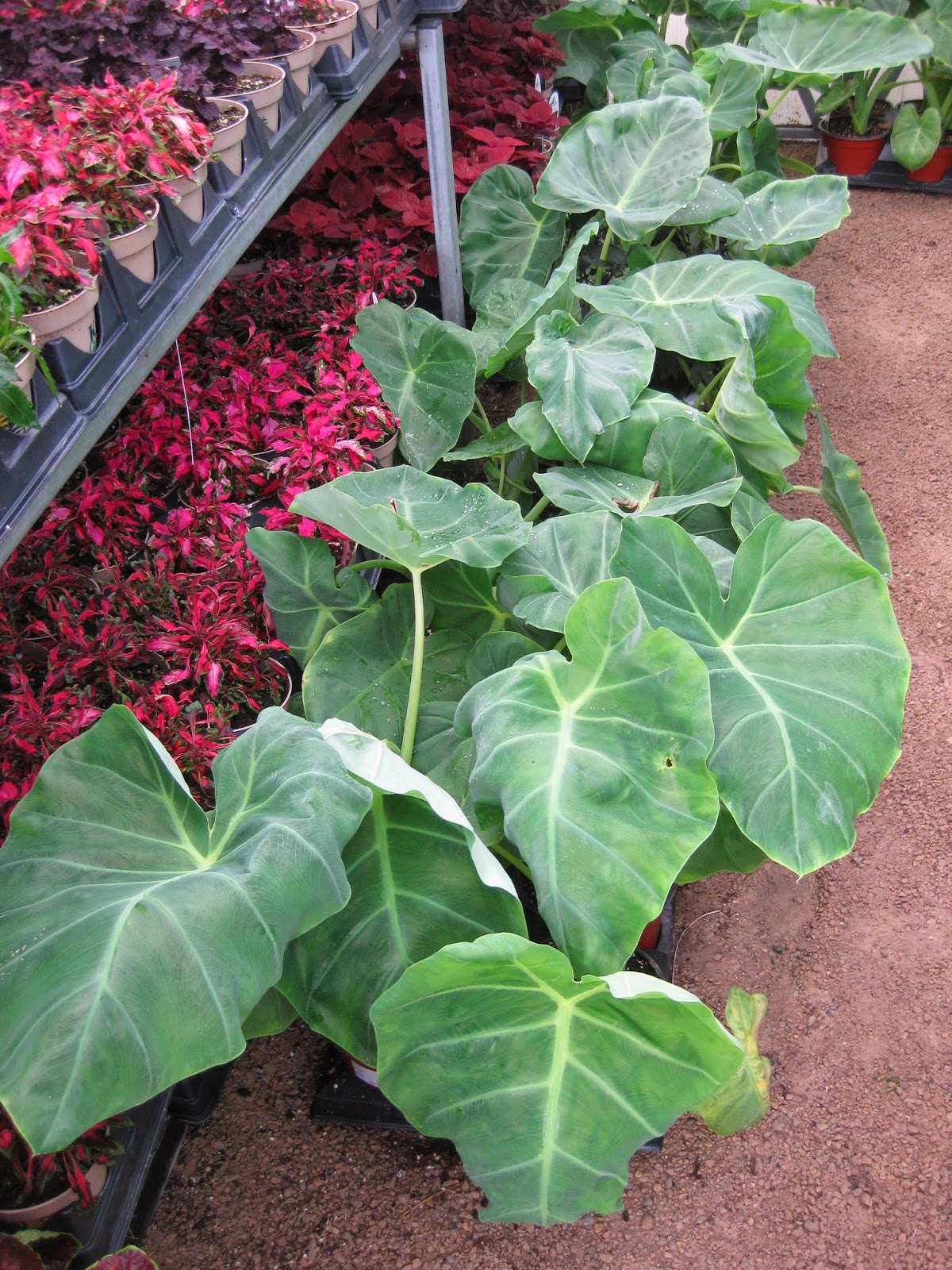 Our three greenhouses are "a burstin" with color and this only represents about 20% of our incoming plants for the year! Above are the 'Thailand Giant' elephant ears (Colocasia gigantea) which will be a big part of our Jungle Garden theme. Lots of fun plants ready to go. Now we just need some sunshine and warmth!!!!