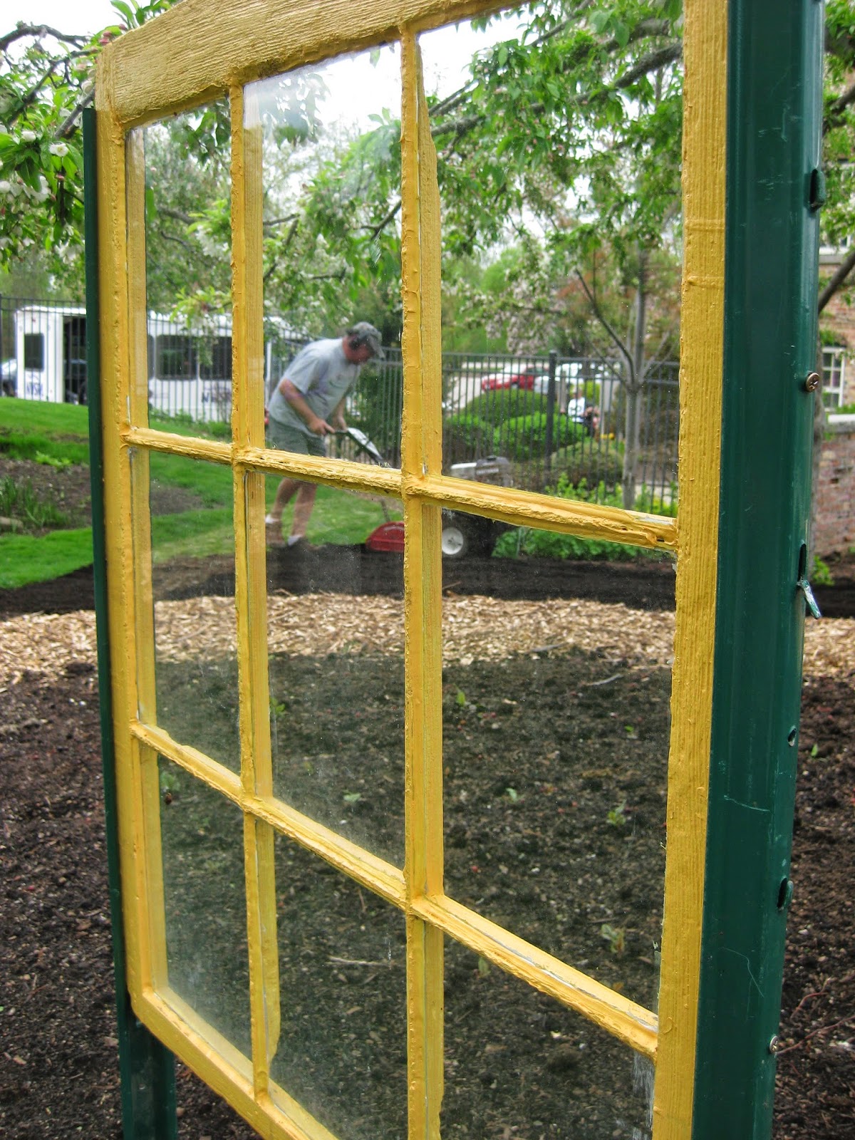 The grounds staff had a busy day as usual and we had almost a full crew (sans Terry). Pat (third photo down) did a great job putting together our second giant obelisk which he also painted earlier in the week. Larry and Cindy were in for a half day and did a wide range of activities related to the plant sale, garden clean-up, water feature maintenance and other tasks. Jenny spent most of the day tidying in the fern & moss garden and Japanese garden which are both featuring their first wave of weeds and have some last minute spring clean-up needs. Cheryl spent time helping in the plant sale and transitioned to garden clean-up in the terrace, Nancy Yahr Memorial Children's Garden, North point and alpine garden. Big John also helped with the plant sale and did a bang up job rototilling (fourth photo down) in the Jungle Garden. Note my artsy photo with John seen through a window. Windows and doors are part of this unique garden theme this year. Janice was in to work with our Chestnut House volunteers this afternoon. I was outside more than I have been all year but the desk work calls me back often enough.