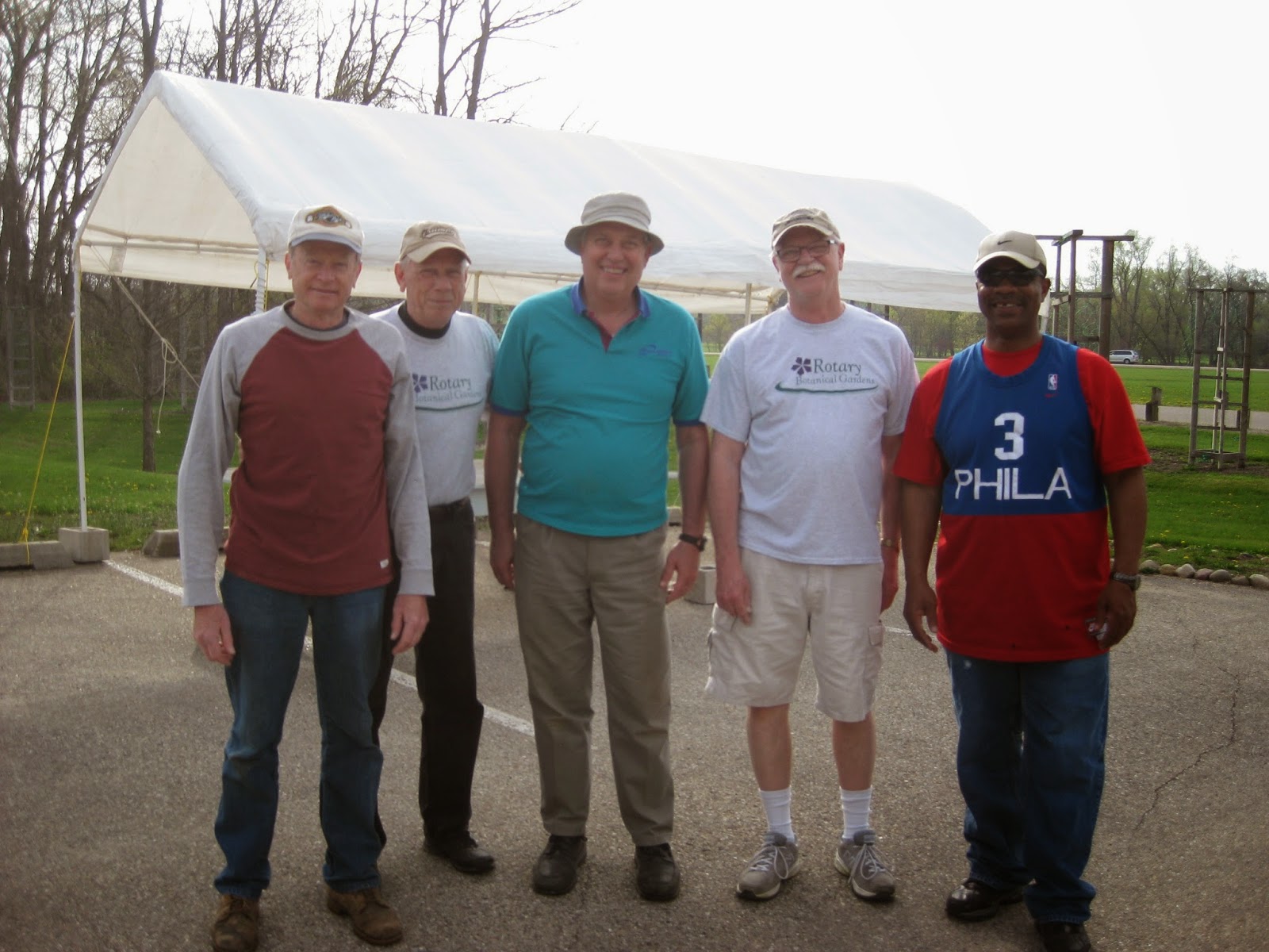 We're ready for the start of the Tree Sale tomorrow (9 am - 4 pm) and the RBG Members Only Spring Plant Sale (pre-sale), also from 9 am - 4 pm. Both sales continue Saturday and Sunday for the same hours at the Horticulture Center. It was our busiest day yet this year with over 50 volunteers coming in over the course of the day to help prepare for both sales as well as to accomplish gardening duties. Just some of our many helpers are featured below. Nice shot above of some white daffodils (Narcissus) near the formal gardens this morning. Janice kept the sale organized and on track and Jenny was a huge help as well. Apologies in advance for those I miss but our plant sale helpers included Don, Pearl, Nancy, Gary B., Shirley, Tina, Bev W., Karen, Pat R., Doris, Magda, Joy, Bob K. and many others. Our Grumpies included the ugly mugs seen below. From left to right are Larry H., Ron W., Ron P., Ron R. and Emmit. The guys helped secure the tents as we've had high winds with more coming tonight. These guys later shifted to mulching and tidying the main parking lot. Dick P. placed memorial bricks and Maury was bouncing between many projects. Vern, Ron Y. and Jim worked on carpentry projects while Dr. Gredler and Bill O. did their riding mowing rounds. Eva, Kathy and Barb (new Grumpette) helped tidy multiple areas with a strong focus on the sunken garden. Karen M. was out tidying in the Japanese garden. We also saw Kris K., Bob C., Cindy B., Jean S., Mary W., Lynda S., El, Cynthia, Pat C. and many others today. Too many comings and goings to keep track of accurately. Further below are shots of the Golden Kiwanis members processing the trees for the sale. The guys did a great job.