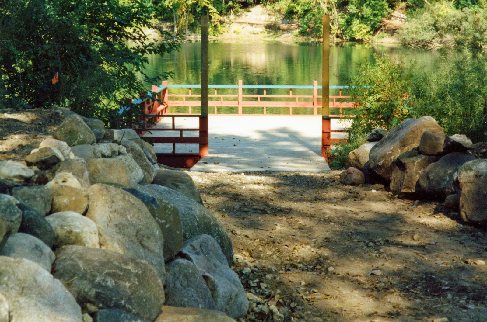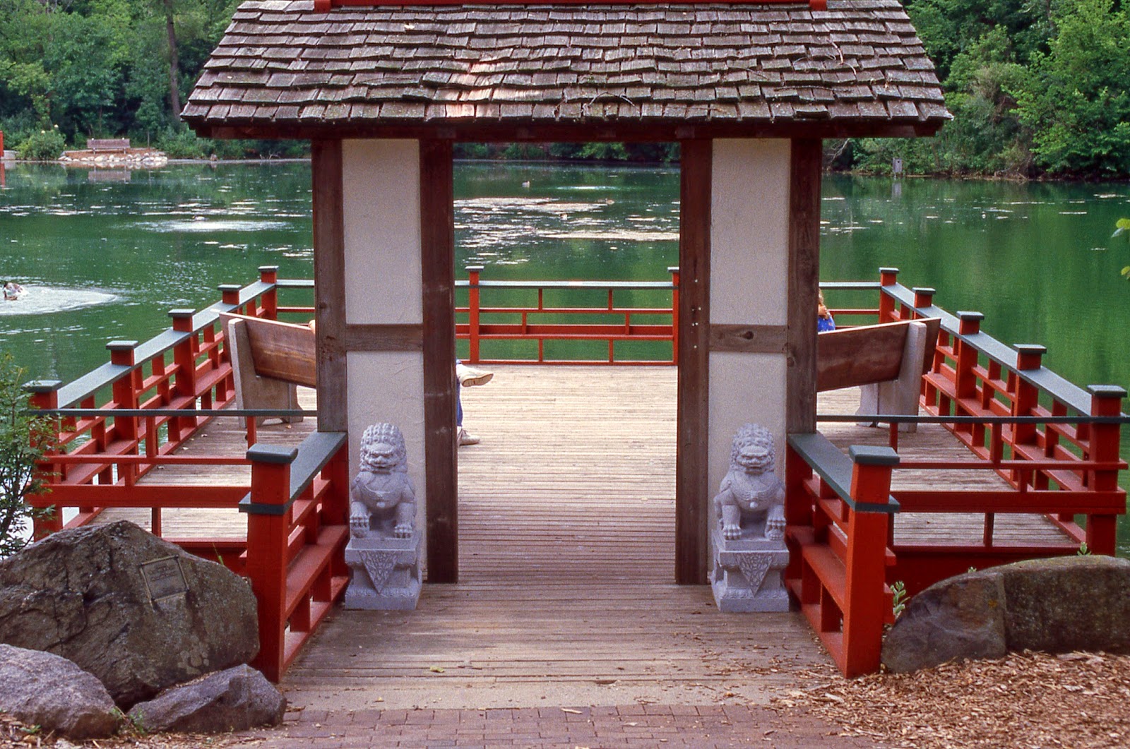 Our weekly historical RBG installment shows the progress of the observation pier overlooking our three acre pond. The photo above is recent and note the nice view of the pond, arched bridge and surrounding landscape. The observation pier I believe was built and finished in 1992 although I'm not 100% sure on that account. Meant to bring visitors closer to the water and to provide a wonderful view, this structure was also built to accommodate all accessible fishing opportunities. It was originally called "The Fishing Pier." Fishing is still allowed at RBG and while we are the only botanical garden I know of that allows fishing, this pier is enjoyed and utilized by most of our guests for one reason or another. During our Holiday Lights Show, the view from this structure is amazing. We repaint this every couple of years and the Japanese style structure was re-roofed two years ago. Note the polished granite lions to the left and right of the entrance way. In regards to those lions, a Chinese guest last year explained that one is a boy and one is a girl. The boy has a paw resting on a ball while the girl has a small cub under her paw. That was neat to learn! These were vandalized during the 2006 incident which saw significant damage around the entire gardens. Thankfully they were too heavy to steal, break or throw in the water (just tipped over)! Note the progress of this structure further below with captions.