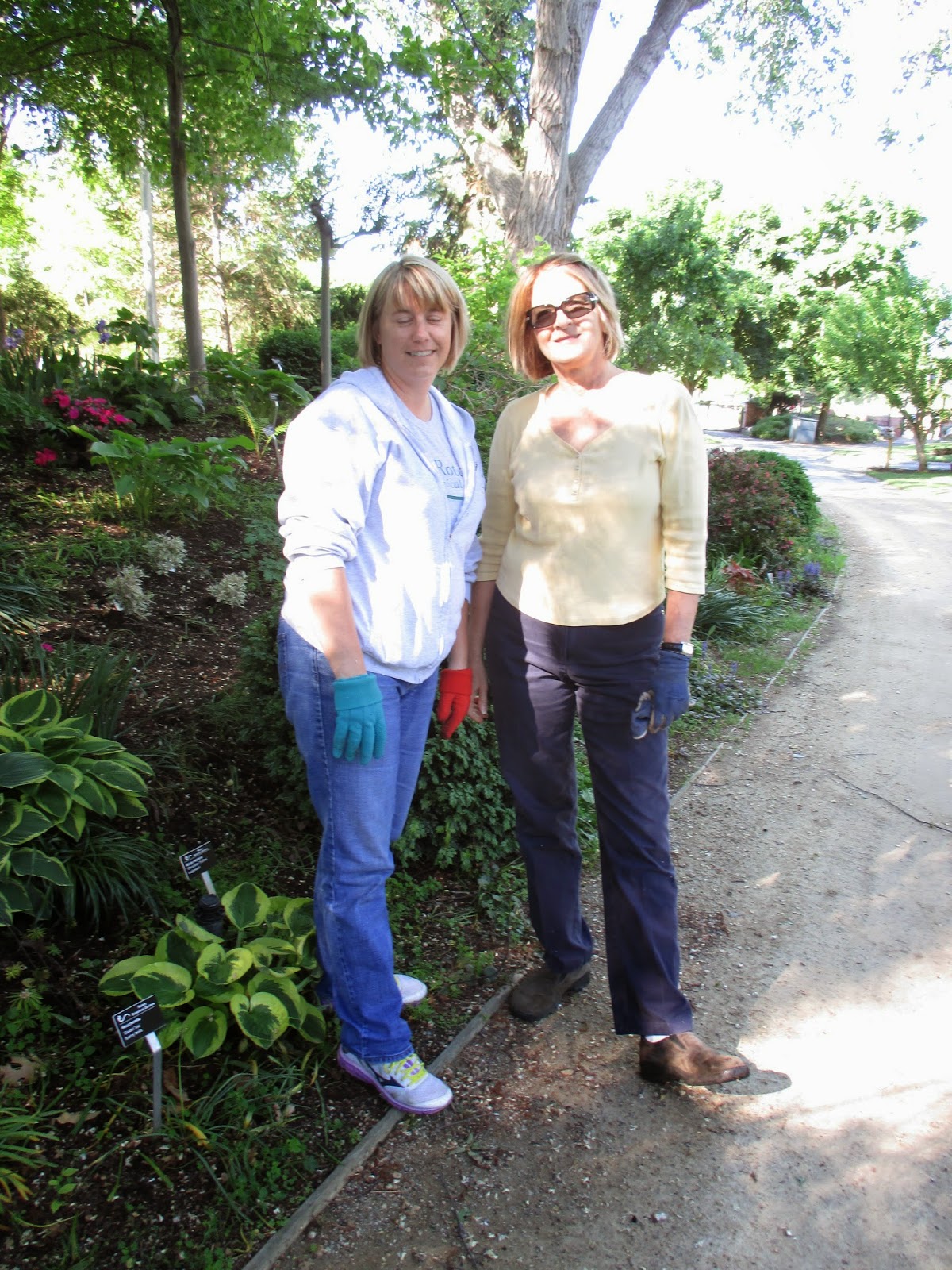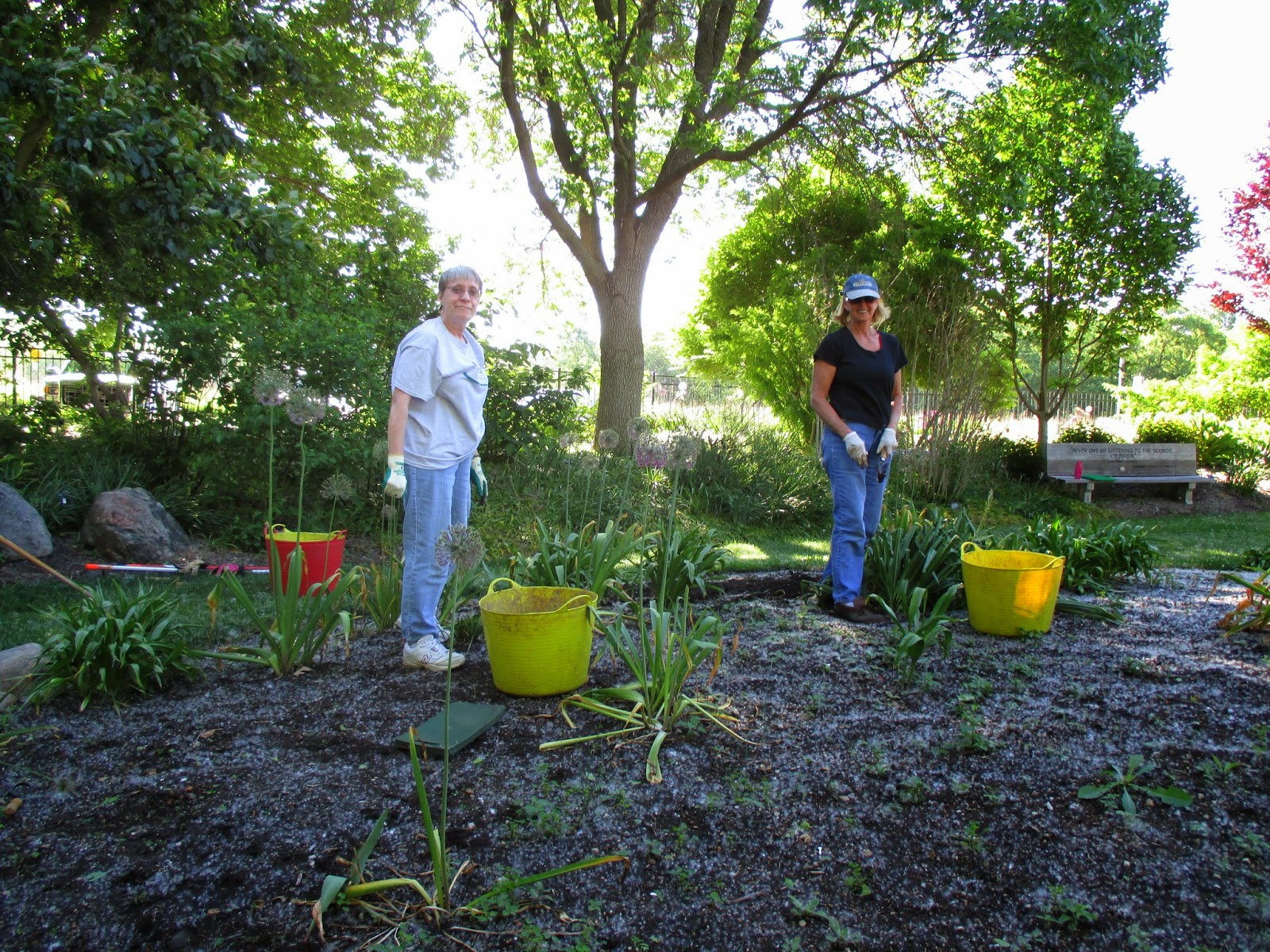 We had lots of staff and volunteer activities today and also had some VIPs arrive as well. Some relatives of the famous WI hosta breeder Eunice Fisher stopped by today. Eunice also helped found the American Hosta Society. Above is Janice with Ed Fisher (95 year old son of Eunice) and Kathy and Jenny (far right), two great granddaughters of Eunice. Both Olbrich Botanical Gardens (Madison, WI) and RBG are trying to feature the entire Eunice Fisher collection of hostas and the Fisher family (led by Jenny) is helping to research and acquire rare Fisher hosta varieties as we share/swap/procure/install additional varieties over the coming months. We were brought hostas today and we sent the gang off with some too for Olbrich! Janice gave them a tour and this trio were great to talk with this morning. Dr. Gredler (seen below) was in for mowing as was Bill O. The second photo down shows Betty (left) and Renee weeding this morning and the ladies moved on to other areas as well. Kay planted and tidied her area in the shade garden this morning and both Roy and Mary came in for more planting in the shade garden. Kelley and Sue (third photo down...Kelley with her eyes shut) did a great job tidying and planting their section of the shade garden and put lots of color out there. Ron K. tidied up the woodland walk garden and both Eva and Kathy worked on weeding out two areas in anticipation of planting later this week. Vicki and Steve (fourth photo down) were in almost all day and they single handedly (actually four hands) planted 3,000 impatiens in that berm! Cora and Jane planted over 20 large containers this morning and will return for more next week. Karen came in for work in the Japanese garden and Urban (fifth photo down) did some pruning. Vern (sixth photo down) came in for painting duties on a repaired gate for the Scottish garden. Bob T. was in most of the day for his air edging duties and we also saw Dr. Yahr (seventh photo down), Gary S., Maury, Mary Kay, Janet M. and many others. Our Home Garden Tour committee met early in the evening as well (Barb, Bill, Janet, Marcia, Tom, Sue, Jean and Cora). Mark down July 12th for this great event and see our website for more details! Tickets are on sale now at both K&W Greenery and RBG. It was a crazy day but everyone kept up (me, just barely).