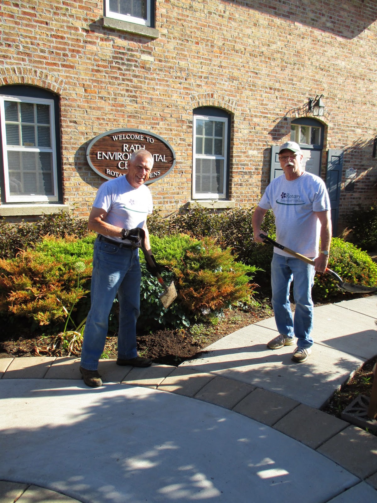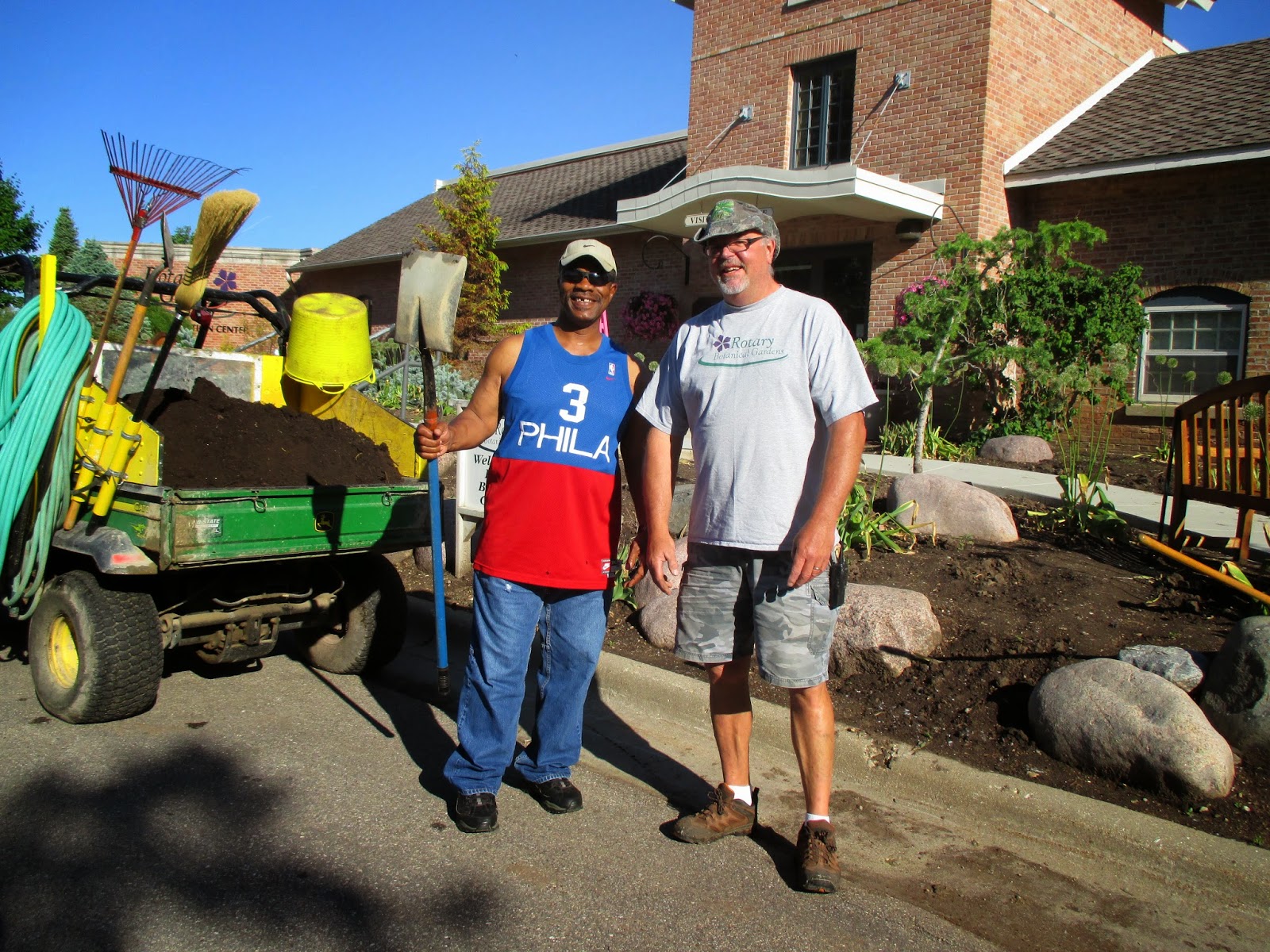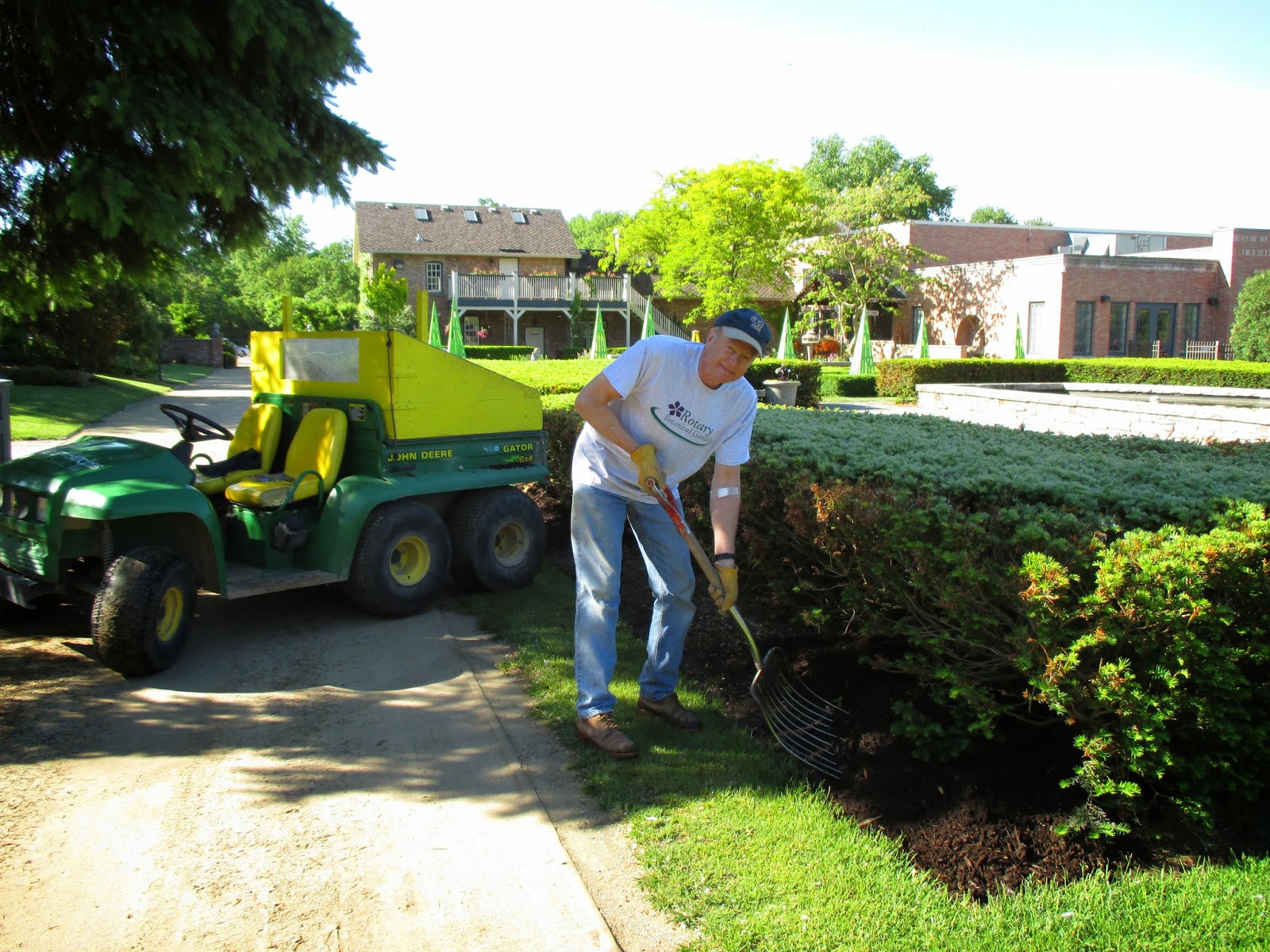 The Grumpies and Grumpettes (aka Women Weed Warriors) were in full force today. Above is Emmett (left) with Big John. John worked with Emmett and Ron W. and Ron R. (seen directly below) on an important soil project in front of the Parker Education Center. With new concrete walkways, we needed to adjust the grade in many locations with adding fill or removing soil in some locations. These four guys did a great job and nearby were Shirley, Kay and Eva weeding and planting in the same area. These ladies can be seen in the second photo down and they also shifted to some planting in the gazebo garden later in the morning. The second photo down shows Gary B. (left) and Bob C. cutting back ornamental onion (Allium 'Purple Sensation') foliage near the daylily (Hemerocallis) collection. This was a huge project. Speaking of huge projects, the fourth photo down shows Karen, Marilyn, Mary and Susie who weeded the entire Nancy Yahr Memorial Children's Garden prior to planting this Saturday. Bethany helped out later and worked the remainder of the day in that space to finish it up. That garden will feature our "Pollinator's Paradise" theme using a wide range of All-America Selections (AAS) winners. We've entered this display in the annual AAS Landscape Design Competition which we've won the last two years (and are planning for the three-peat victory!). It will be nice to get it all planted this Saturday at our next Volunteer Planting Workday (8 am - 12 noon). The next photo shows Larry H. mulching around the koi pond yew (Taxus) hedges and he did a nice job as usual. Bob T. was in later to air edge the Cosmos Collection beds too. Steve and Vicky planted almost 100 large cannas in our Jungle Garden theme and continued planting in the gazebo garden. Dr. Gredler was in for mowing and our carpenters (Jim, Dave, Vern and Ron Y.) kept busy with repairs on the Japanese garden fence (see further down). Dick P. and Dick H. did some troubleshooting on two of our vehicles and Maury ran more errands for us. Marianne G. helped weed in the Thomas Jefferson Collection too! Bev W. planted over 250 more annuals in the sunken garden and her section is looking sharp! Jumbo Jim brought down four RECAPPERS and the guys accomplished a lot of work this afternoon. It was a busy day and we also saw Charlotte S., Iza, Dr. Yahr, Rollie M. and many others today.