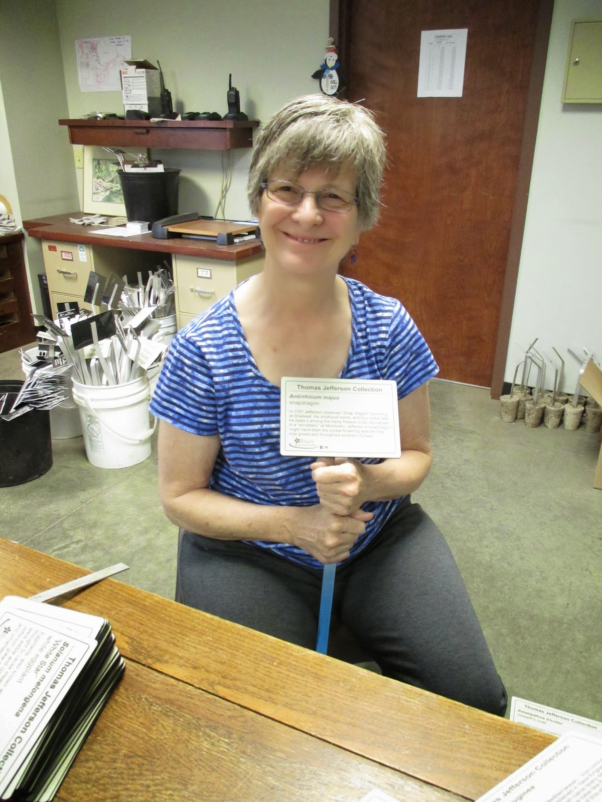Patrea (above) came in to work on more signage out in the gardens including finishing up the interpretive signs for the Thomas Jefferson Collection and getting them installed. She did a great job and had a busy morning with plant labels as well. Vern came in for some carpentry work and Dick H. stopped by as well to look at some of our impending and current vehicle problems. Maury ran some errands and we also saw Dave G., Ron W., Rollie, Bob K. (with two granddaughters) and many others. Janice stopped by to work on some projects as well. Below are some more plant shots from today.