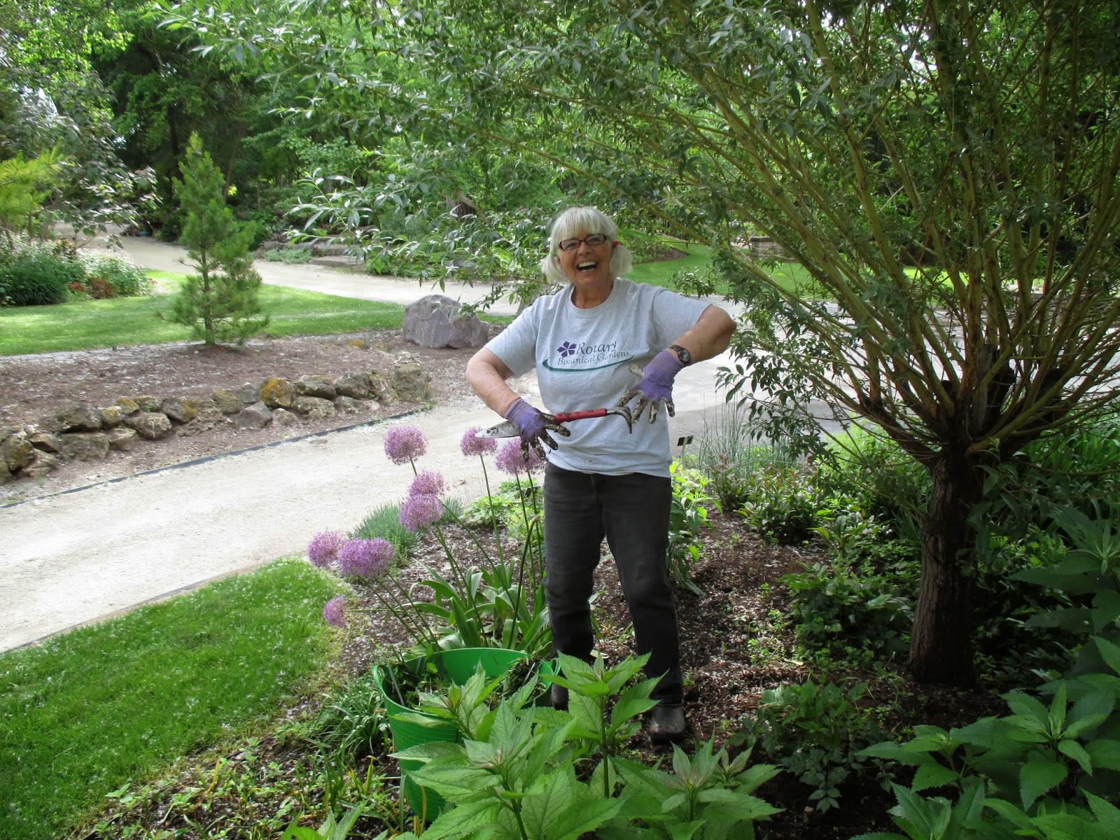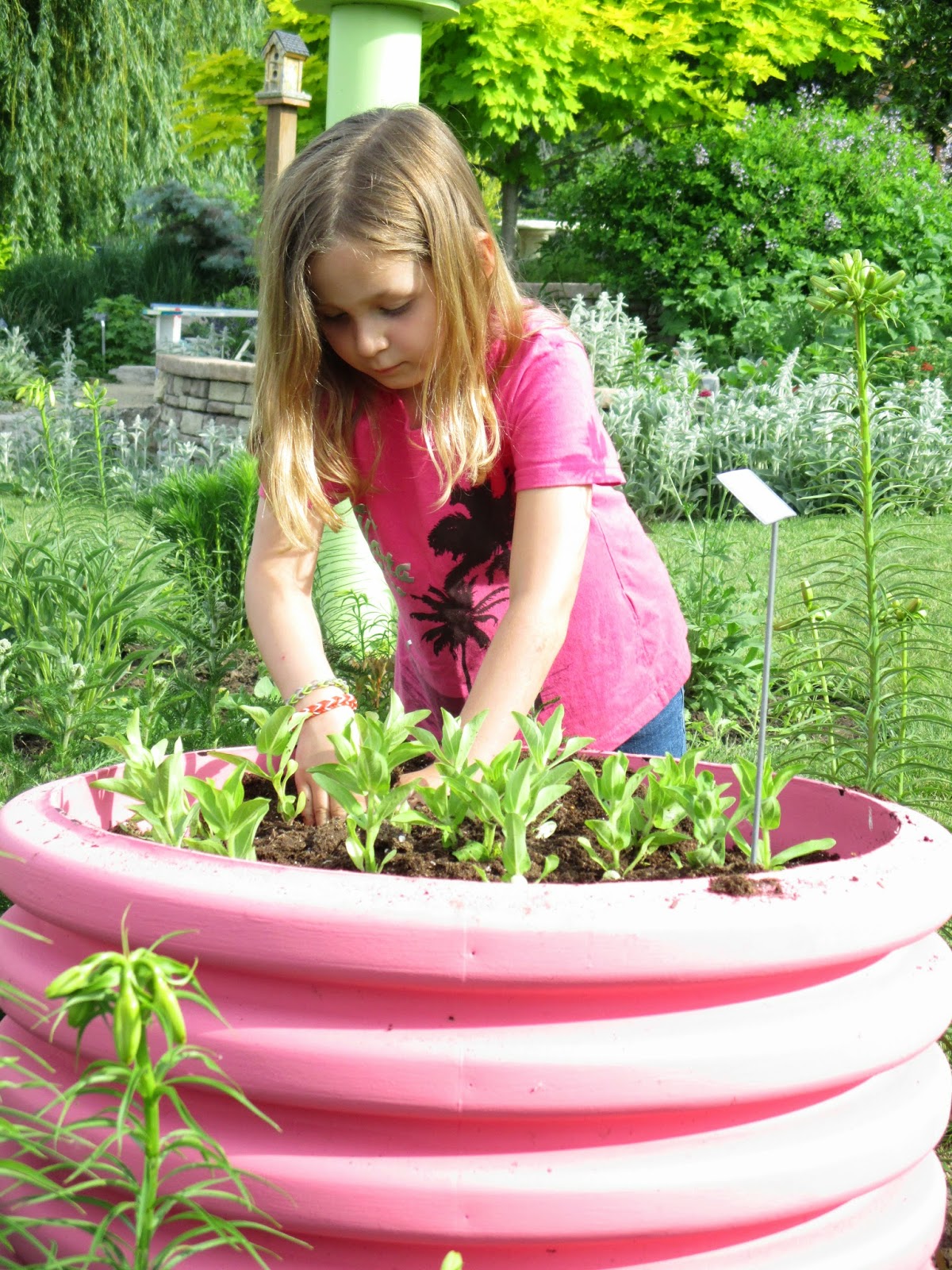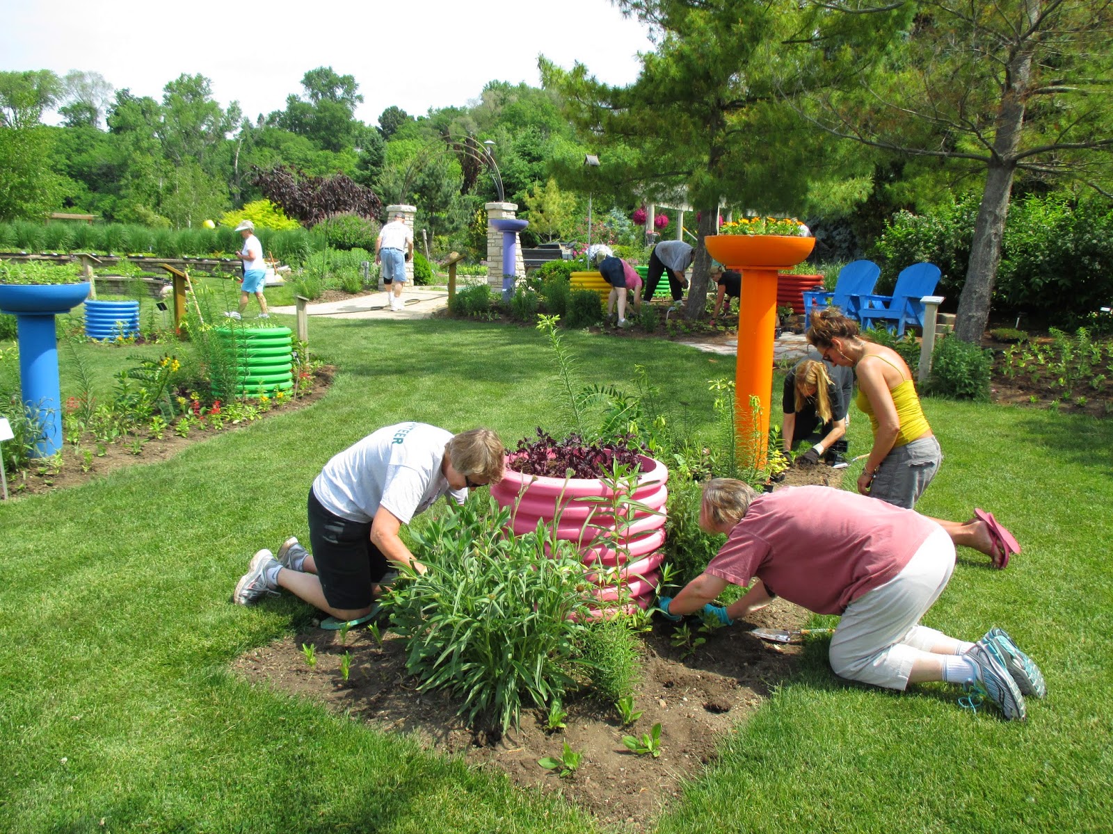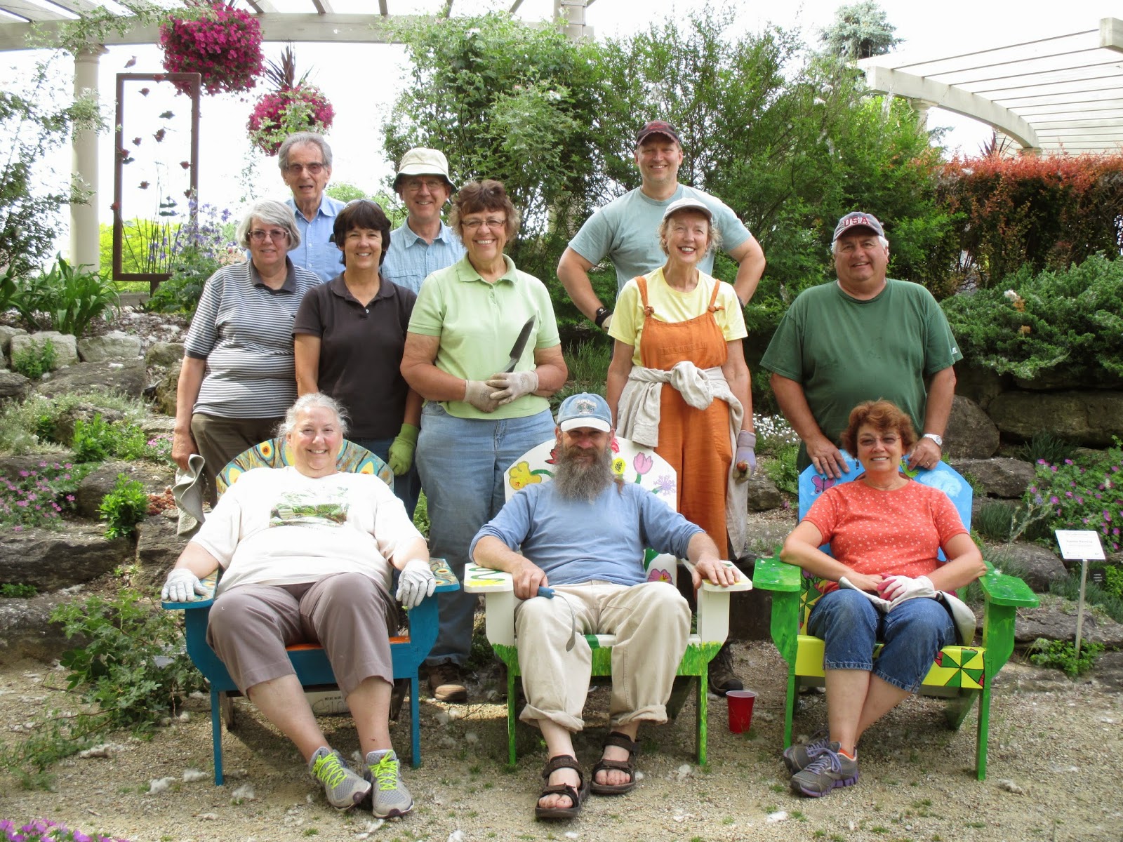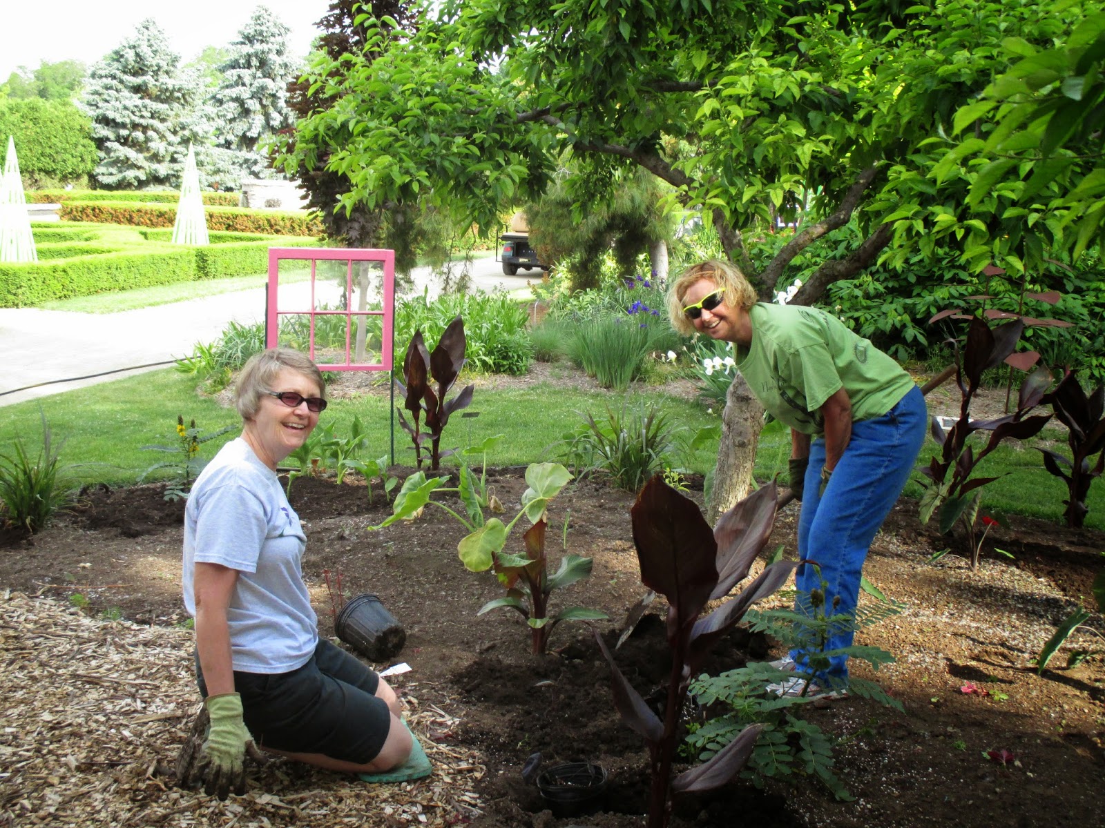 The weather was perfect for our fifth sequential Volunteer Work Day today with lots of help throughout the gardens. We planted the "Pollinator's Paradise" theme with our All-America Selections (AAS) winners in the Nancy Yahr Memorial Children's Garden this morning. We also had a crew plant over 300 larger tropicals in our Jungle Garden theme as well. Some assigned gardeners (Sue, Kelley, Marleen, Mirjam and Marcia) were also in to plant their areas and we had help on the vegetable beds at the Horticulture Center. We had 27 volunteers helping directly with the planting project, 5 assigned gardeners planting this morning, 3 volunteers at the Horticulture Center and also the help from Bill O., Dr. Gredler, Maury and many others. We actually were able to plant some of the pink theme in front of the Parker Education Center which was our back-up project after the other two planting projects were completed and watered well. As I type this evening, some nice rains will soak down the gardens and I'll sleep better tonight knowing that Mother Nature has come through for us! Larry, Janice and Big John were awesome help today as usual and I'm proud of how smooth our team works together when keeping this many volunteers organized, occupied and focused. We also had members of the WI/IL Chapter of the North American Rock Garden Society (NARGS) weeding in the alpine garden (see bottom photo) so our total volunteer count today was well over forty! We're so thankful for the team effort and will continue to work our gardening "kung fu" over the coming week with daily weeding, planting and another productive Volunteer Work Day on June 14th!