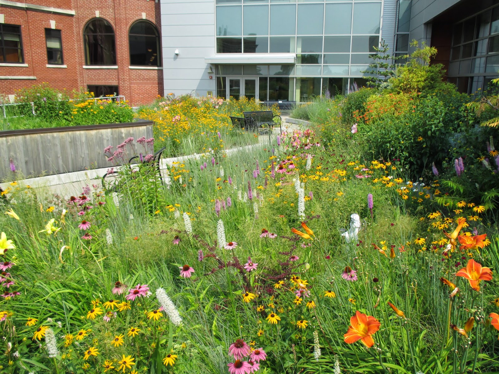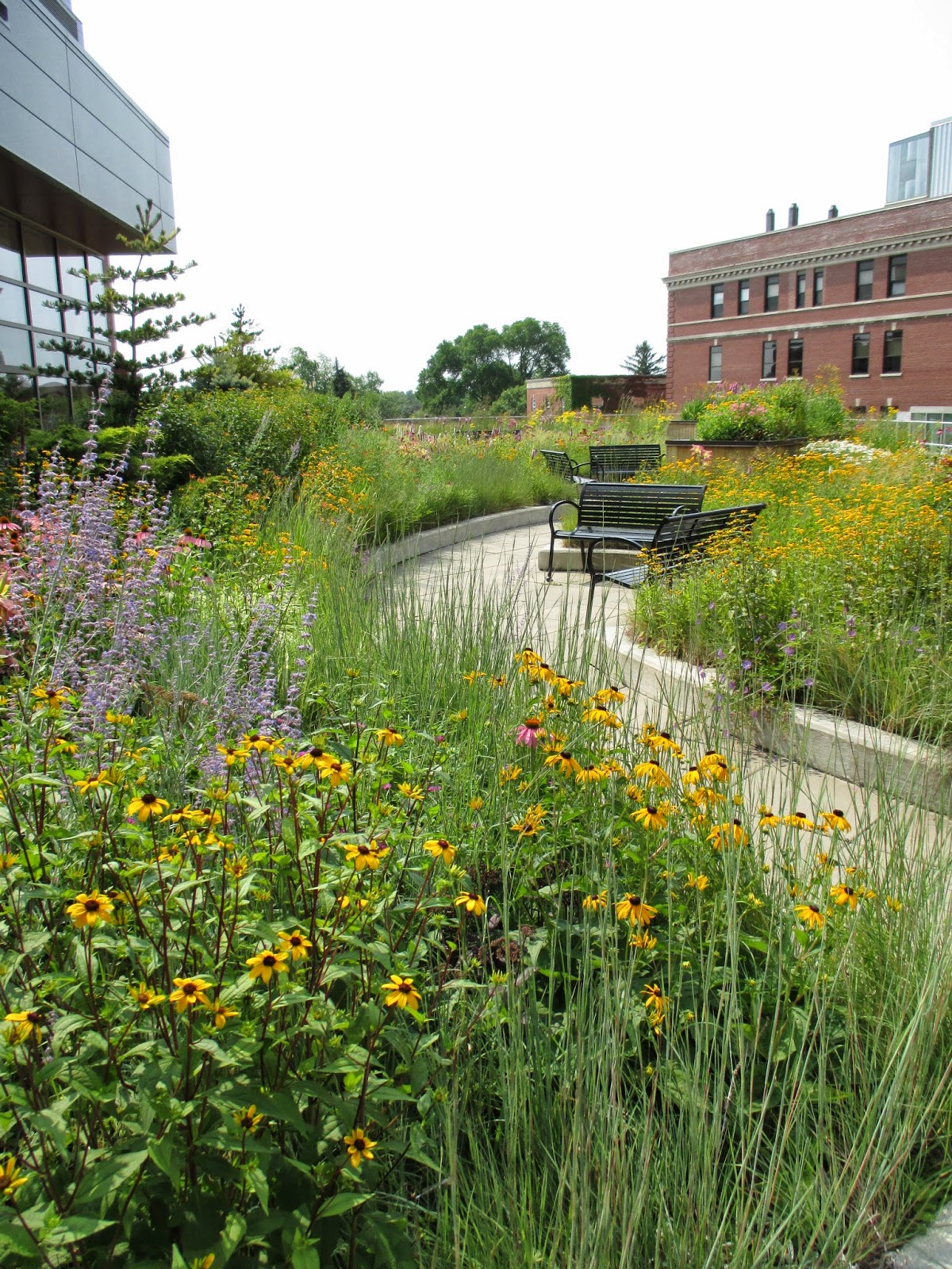 I was off today but was thankfully able to "get my fix" at St. Mary's Hospital in Madison, WI. All the images here are from their rooftop garden which was 25,000 square feet of dynamite. I knew it was there and remember hearing when it was first constructed. I saw it from above first (photo above) and then descended two stories, opened the access door to the garden and meandered. It's old news that patients recovering in rooms with a view such as this recover significantly faster than those recovering (same ailment) in rooms with views of parking lots, walls and "un-nature-like" settings. What a great view and I enjoyed being immersed in this flowing composition which was a whimsical combination of both natives and non-natives with a nice representation of perennial grasses. I chatted with the primary grounds horticulturist, Mike, and we "talked shop" and compared "war stories." I enjoyed the visit and will blog tomorrow regarding their other garden which was top notch and featured a walking labyrinth.
