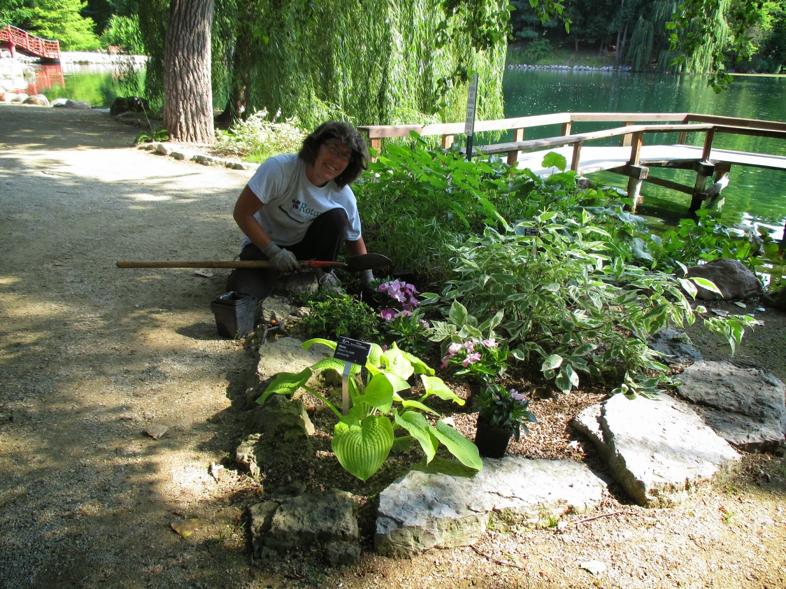 Our volunteers jumped right in to action today. Above is Kay (in blue) working the front entrance garden border. She's not shy about diving in and going after those weeds. The gaps between the original plantings are getting smaller but our volunteers have excellent balance! Not far from Kay were Kathy and Eva weeding for the second day along the entrance garden berm which had plenty of weeds disguising themselves throughout that massive planting. Vicki (seen below) did some significant planting and watering before joining Kay and Eva with their weeding project. Dr. Gredler (next photo down) and Bill O. did their mowing rounds today. Cookie and Resa tended the North point garden which is their assigned garden. That space is looking tidy and colorful. Shirley C. was also in this morning to take care of her garden space. Ron K. (third photo down) worked his kung fu in the woodland walk garden which continues to look very nice. We also saw Chuck S., Marsha M., Maury, Dr. Yahr, Bill O. (#2), Julie G. and many others today.