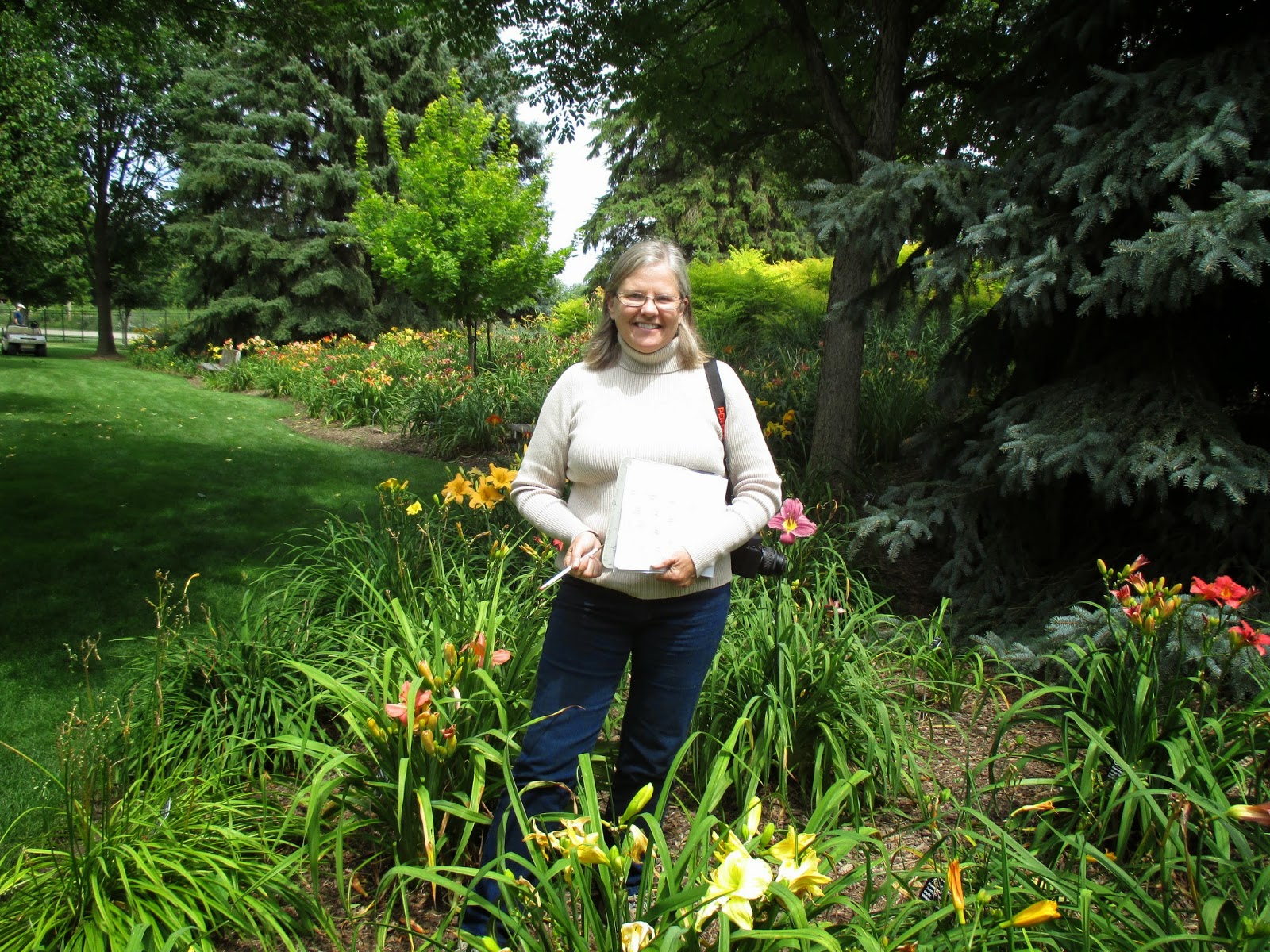 Above is Lisa who has inventoried, catalogued, mapped, tended and observed our Potter Daylily Collection for the past 4 or 5 years. As a member of the Wisconsin Daylily Society (WDS) and a RBG volunteer, Lisa's knowledge is exceptional and her organizational skills are second to none. She has done a superior job keeping our 300+ varieties in good order. As a National Display Garden for the American Hemerocallis Society (AHS), proper display and labeling protocols are vital. This photo is from yesterday as Lisa and I assessed some modifications and proposed changes to the collection which still looks awesome with varieties including those seen below.