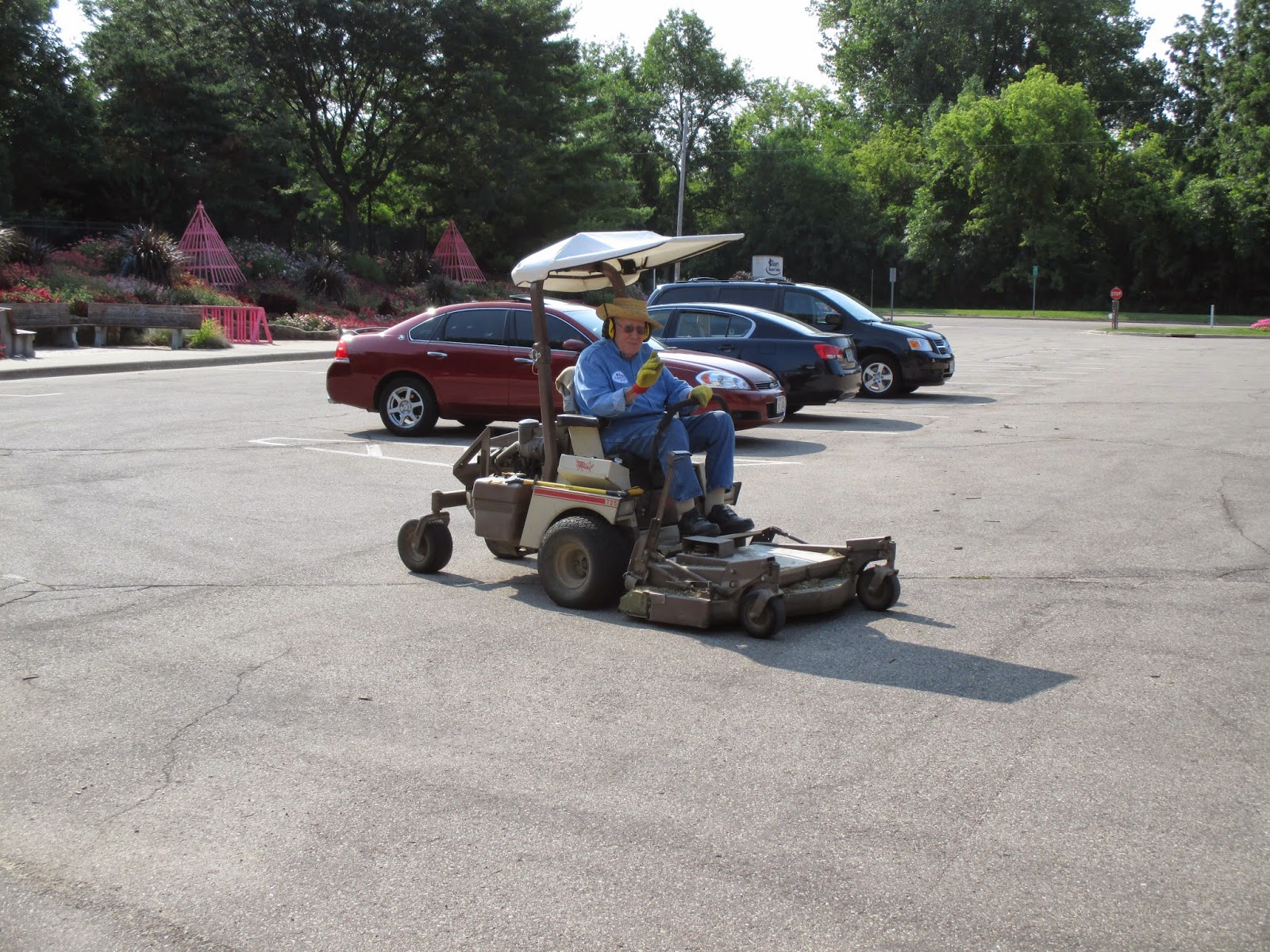 Our volunteers were extremely helpful as usual and we had a nice showing of Grumpies and Grumpettes. Above is Gary B. watering the Thomas Jefferson Collection which is looking pretty good right now as well. Directly below (left to right) are Kathy, Eva and Taylor. The ladies tip-toed in to the entrance garden slope and are removing some weedy infiltrators! They came back with quite a load of weeds! Karen M. was tidying up in the Japanese garden this morning and Lisa I. arrived this afternoon to take a closer look at the Potter Daylily Collection which is still at peak. The second photo down shows Ron R. (left) and Bob C. heading out to mulch and water some newly planted trees. The third photo down shows Ron P. who, along with Dick H., did a nice job edging along the arboretum. Dick H. also made some trips to the dump (fourth photo down). Dr. Gredler was in for mowing and Maury ran multiple errands for us too. Ron Y., Dave, Jim, Bob K. and Vern continued producing new obelisks and had some other carpentry duties as well. We also saw Bill O., El, Ron W., Dr. Yahr and many others today.